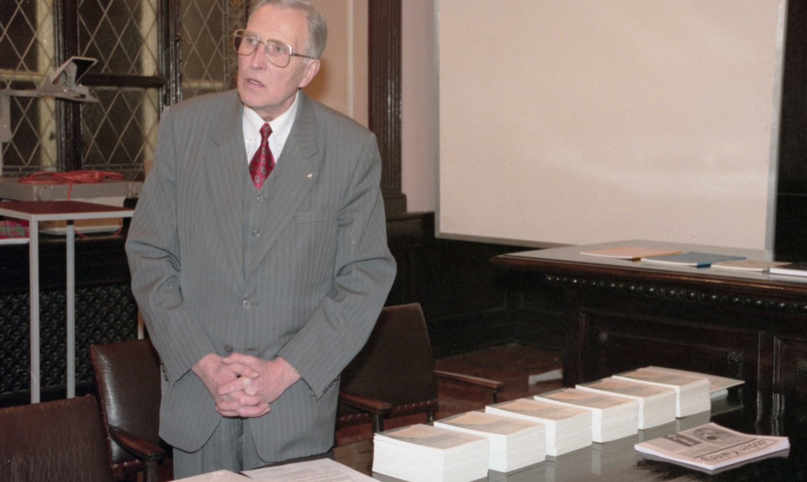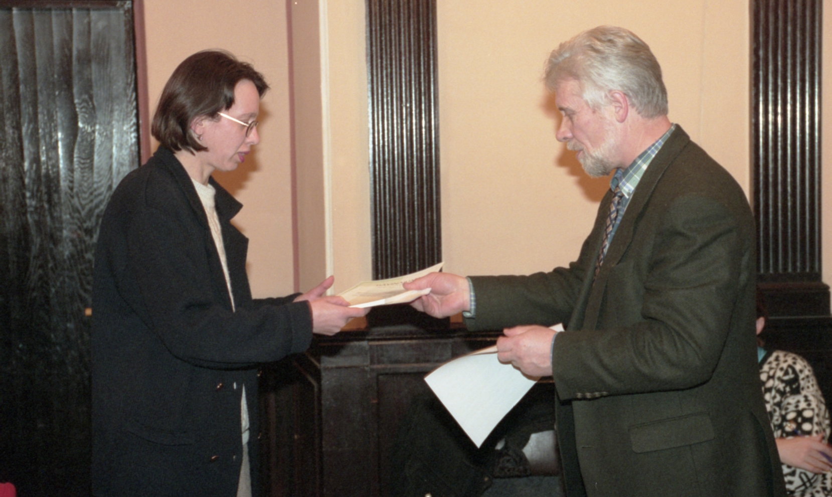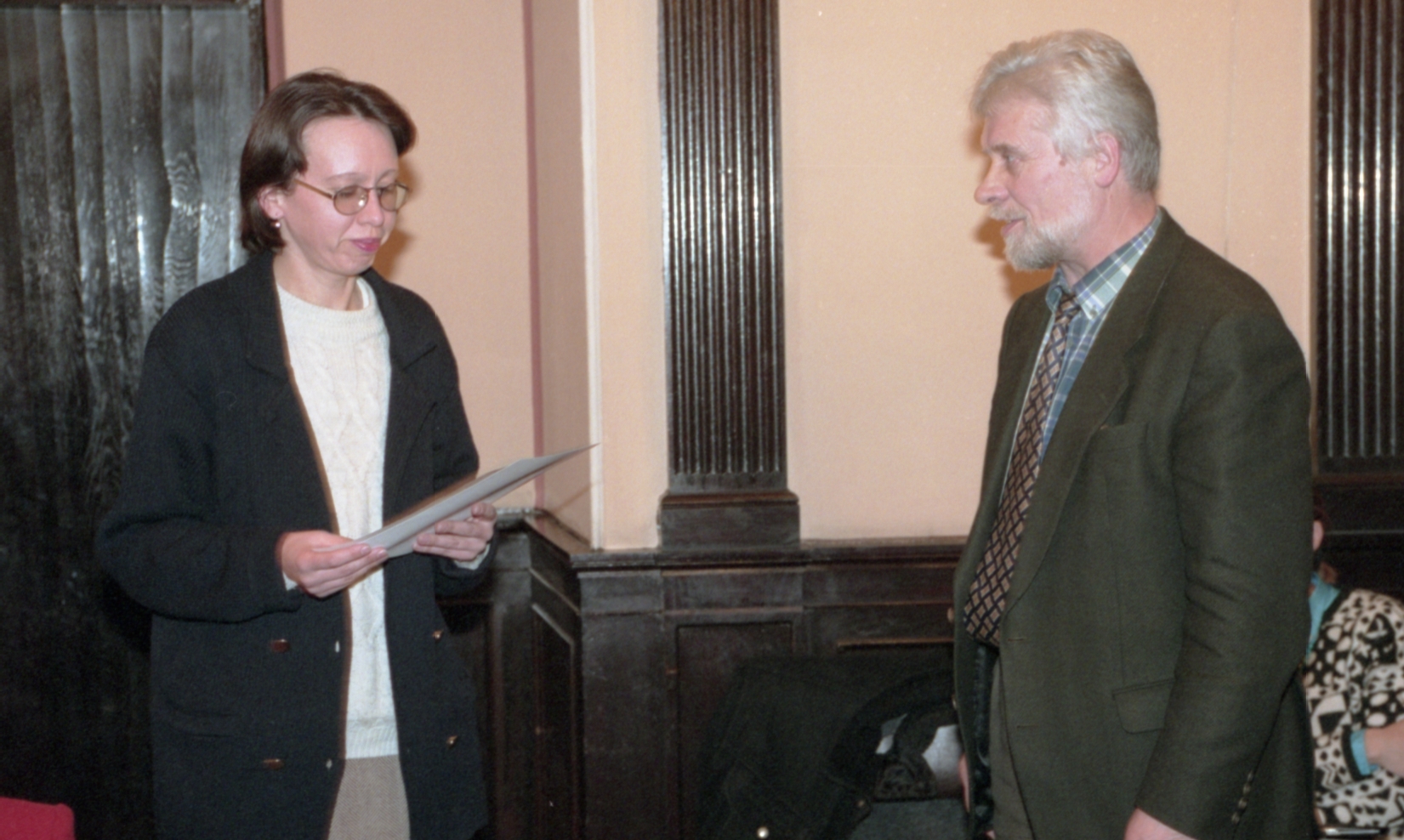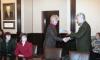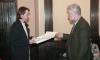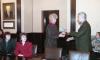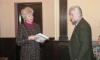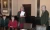Grāmatu dāvināšana Latvijas universitātē. Profesors Imants Meijerovics, akadēmiķis Jānis Bārzdiņš, Ilona Ļegeņkaja, Aija Janbicka.