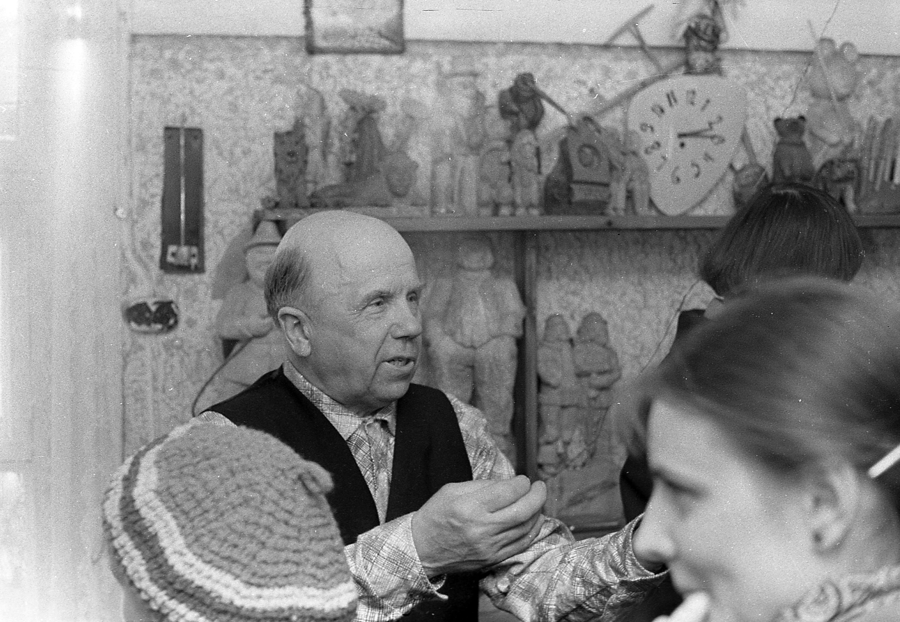Fotogrāfijā redzams latviešu koktēlnieks Valters Hirte, kurš sarunājas ar apmeklētājiem, savās mājās Ļeņina (tagad Pērnavas) ielā 25, Mazsalacā. Iespējams, ka fotogrāfija tapusi t.s. Atvērto durvju dienās, kuru laikā varēja apmeklēt vietējos māksliniekus un iepazīties ar viņu darbiem. Pie telpas sienas redzami plaukti ar koka skulptūrām, kuras viņš pats dēvēja par "kloņģīšiem".