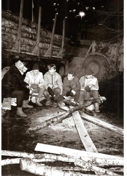 Fotogrāfijā redzami mazsalacieši barikādēs Rīgā 1991. gada janvārī. Vīrieši sēž pie ugunskura, aiz viņiem redzama ar kokiem piekrauta automašīnas piekabe un traktors.
