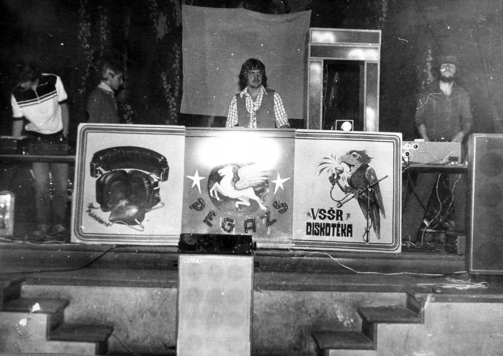 Fotogrāfijā redzama VSŠR diskotēkas “Disko Pegazs” komanda Dikļos 1981. gada vasarā. Noformējumā redzami trīs Edgara Ceriņa veidoti plakāti. Pirmais no kreisās puses Guntars Akmentiņš, otrais Andis Kaimiņš, trešais Andris Etmanis, ceturtais Jānis Višķers.