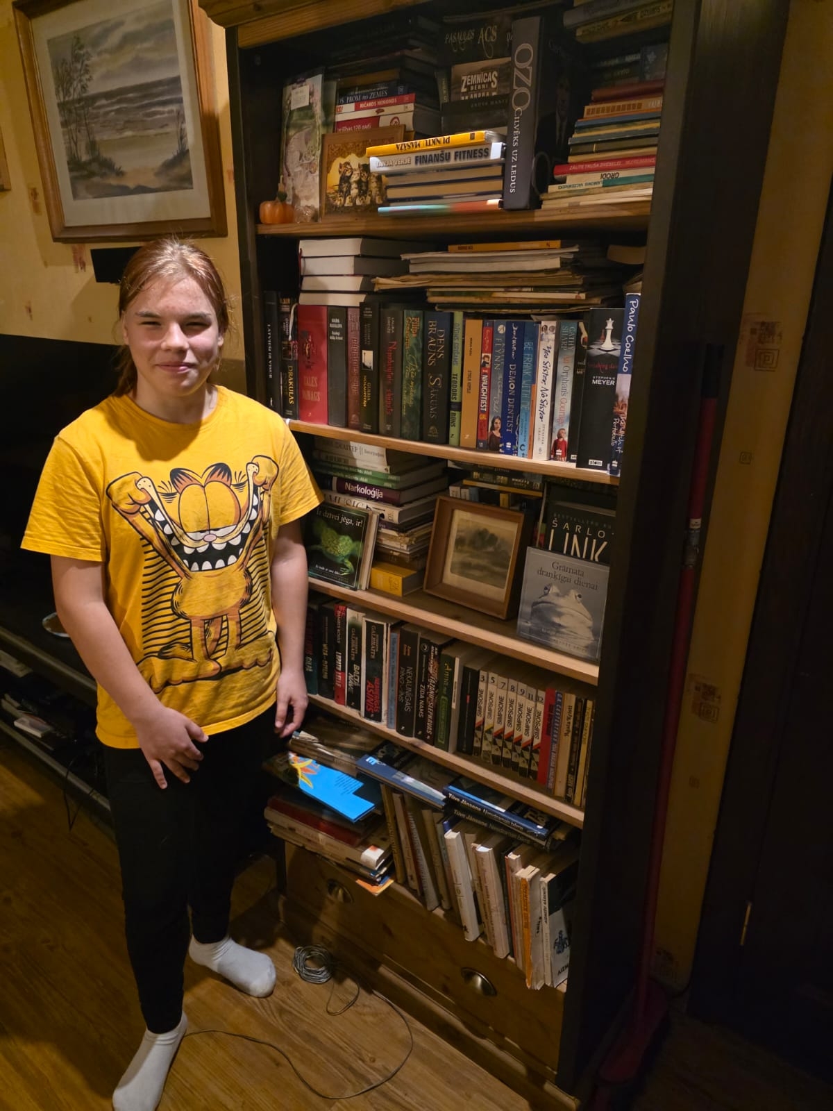 Mūsu grāmatplauktam ir vairāk kā 20 gadu. Kad vecāki nopirka māju, abiem līdzi bija daudz grāmatu, tāpēc gramatplaukts bija viens no pirmajiem lielajiem pirkumiem. Tur atstāja vismīļākās grāmatas, citas tika uzdāvinātās bibliotēkām. Skapī ir bērnības labākas grāmatas - gan pasakas, gan Vinnija Pūka piedzīvojuma grāmatas, gan Ziemassvētku dzejoļi un stāsti. Ir pusaudžu grāmatas - par piedzīvojumiem, burvestībām, vanpīriem, Hariju Poteru. Ir arī Latvijas dzeja, klasiķu darbi. Tur ir arī 2 grāmatas ar manas mammas dzeju. Mana mīļākā grāmatplauktā ir "Komēta nāk", to uzrakstīja Tūve Jānsone.