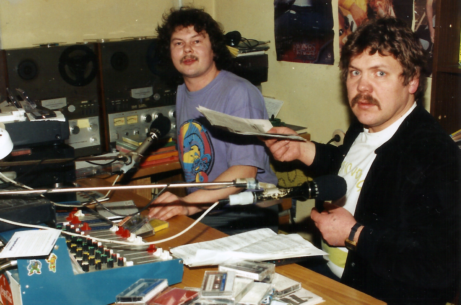 Fotogrāfijā pirmais no kreisās puses Andris Etmanis, viņam blakus pie skaņu pults Guntars Akmentiņš. Viņi vada muzikālo programmu radio "Imanta" studijā Valmierā 1995. gadā.
