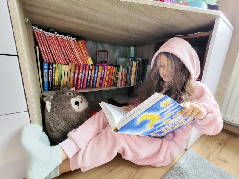 Grāmatas mamma jau pirka, kad biju pavisam maziņa. Ar laiku mana plaukta saturs mainijās atbilstoši vecumam. Grāmatas ir gan latviešu, gan angļu valodā. Gan jauni izdevumi, gan arī 1989.gada izdevums "Slavenais pīlēns Tims" un 1981.gada "Meža olimpiāde". Tomēr Mazā pūķa Kokosrieksta grāmatu sērijas man ir vislielākajā topā! Manu bibliotēku joprojām papildinam ar dažādām "pērlēm", kuras nejauši atrodam. Tāpat, uzsākot skolas gaitas, iepatukās Nikijas dienasgrāmatas sērijas, savukārt Maksa Kramblija dēkas lika smieties gan man, gan mamma. Neiztikām arī bez kinogrāfijām un dažādām pasaku grāmatām. Īpašo M.Stārastes Zelta pasakas man uzdāvināja vecmamma.