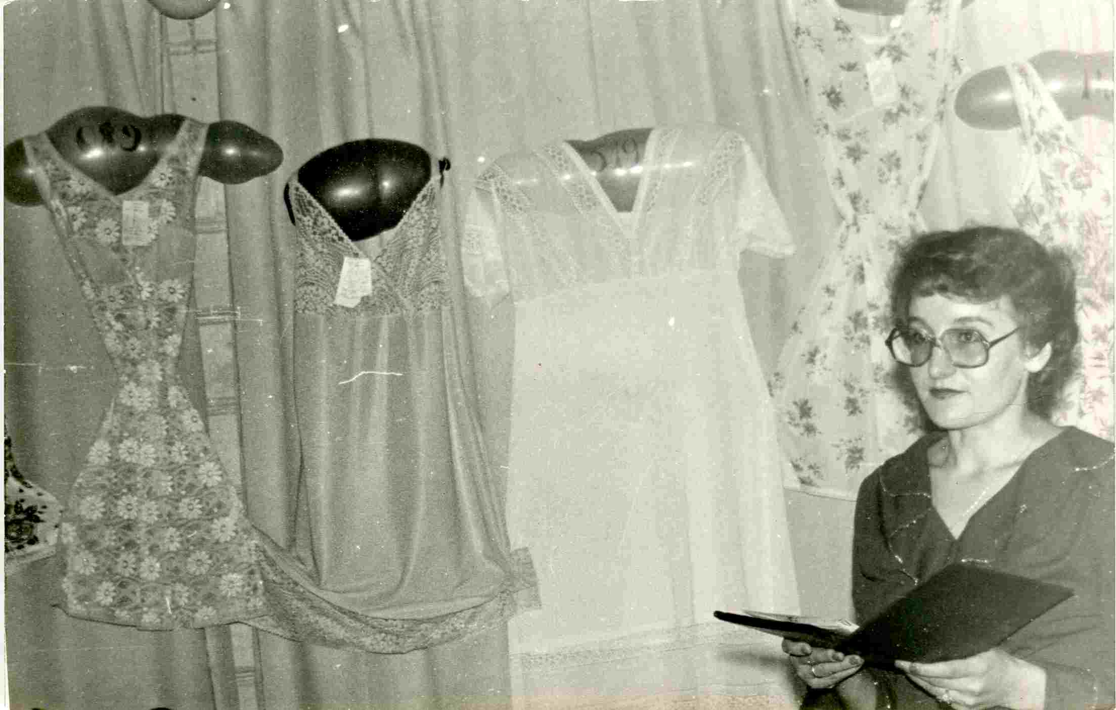 Svinības Ugāles kultūras namā. "Rīgas Adītāja" Ugāles filiāles vadītāja Astrīda Kinne stāsta par paveikto. Fonā uzņēmuma produkcija.