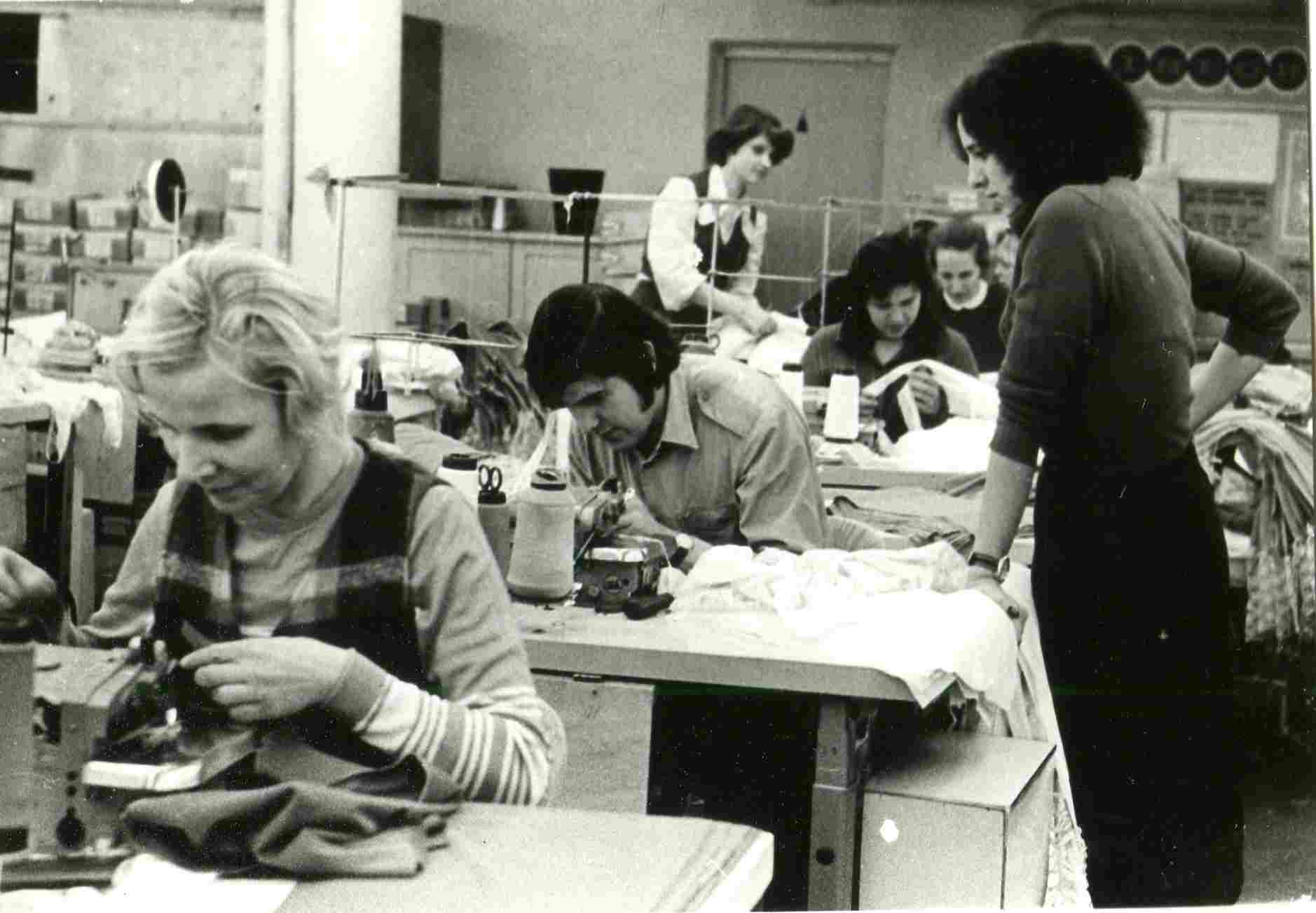 No kreisā: Anna Diedišķe, Oskars Sproģis Daigai Liepālniecei labo šujmašīnu, tālā stāv Rasma Rūma pie Skaidrītes Gruntes