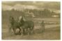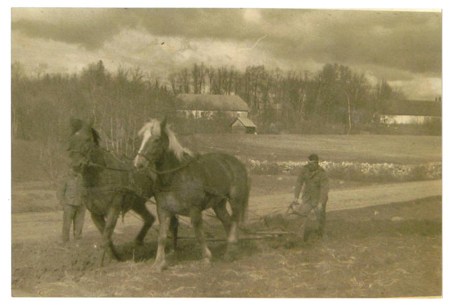 Zirgi apstrādā tīrumu. Skats uz Ēveles muižas klēti un dīķi