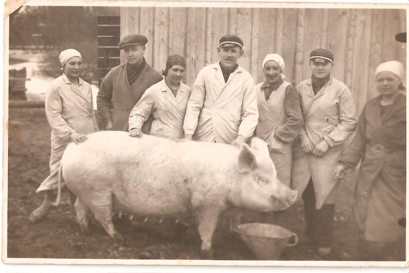 Jaunpils lopkopības skolas praktikanti ar sivēnmāti pēc 1930. gada.