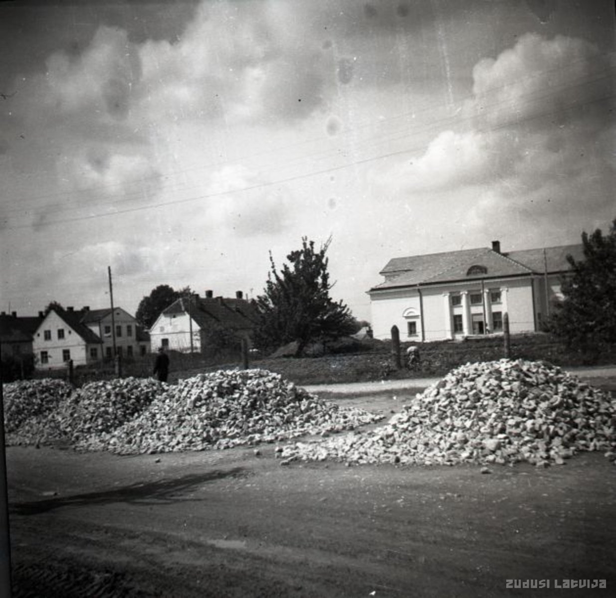 Seguma uzlabošana Dārza ielā. Labajā malā redzams Bauskas kinoteātris „Uzvara”, kuru atklāja 1954.gada 12.septembrī. Kreisajā pusē redzamas dzīvojamās ēkas Padomju ielā (tag. Kalna iela), kuras nojauca 1960.gados. Kinoteātris savu darbību pārtrauca 1990.gados