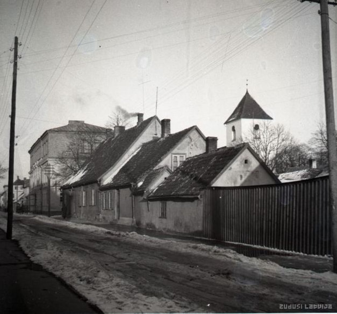 Priekšplānā redzamās dzīvojamās ēkas Rīgas ielā 6 nojauktas 1983.gadā, kad tika celta Sadzīves pakalpojumu kombināta veļas māja. Fonā redzams Sv. Gara luterāņu baznīcas tornis