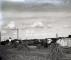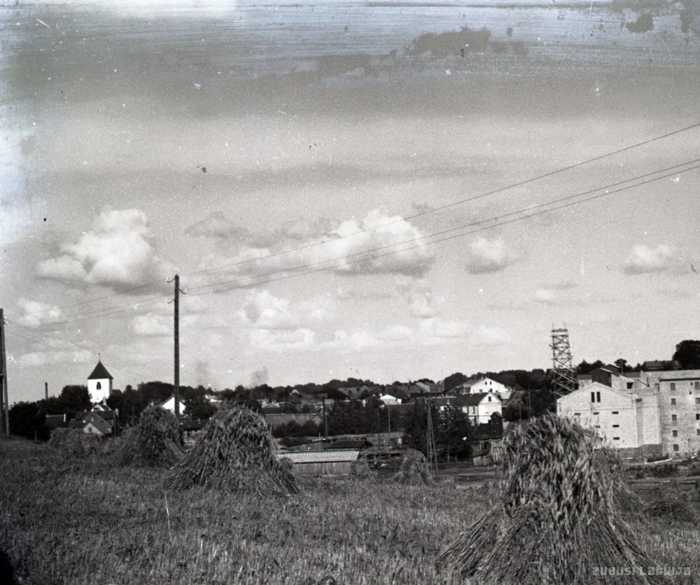 Skats uz Lejas dzirnavām no Mēmeles upes labā krasta. Labajā pusē redzamas Lejas dzirnavas, bet kreisajā pusē – Sv.Gara luterāņu baznīcas tornis. Priekšplānā – rudzu statiņi