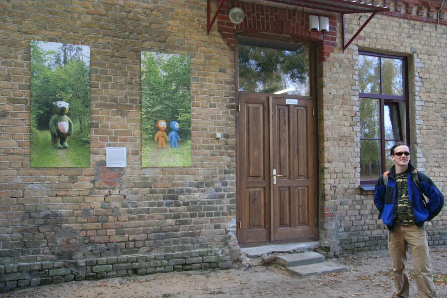 Fotogrāfijā redzams mākslinieks Ivars Drulle pie Valmieras Valsts ģimnāzijas darbnīcas, uz kuras sienas redzami viņa veidotie vides objekti ar teletūbiju attēliem.