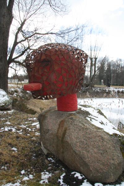 Fotogrāfijā redzama skulptūra - divu tēlnieku kopdarbs - Valmieras Valsts ģimnāzijas Skulptūru dārzā. Skulptūras galvu veidojusi tēlniece Solveiga Vasiļjeva.