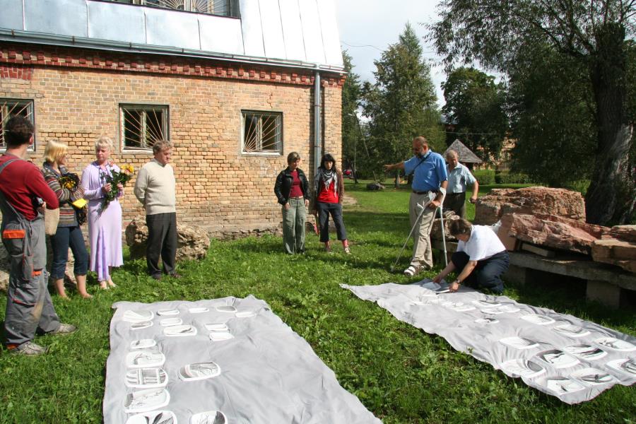 Fotogrāfijā pirmā no labās puses - keramiķe Dace Blūma, kura iekārto sava darba "Lidojums" ekspozīciju pie Valmieras Valsts ģimnāzijas. Viņai blakus stāv Valmieras Valsts ģimnāzijas direktors Jānis Zemļickis. Trešā no kreisās puses ar ziediem rokās - Jolanta Šekstello, viņai blakus - skolotājs, vēsturnieks Jānis Reinvalds.