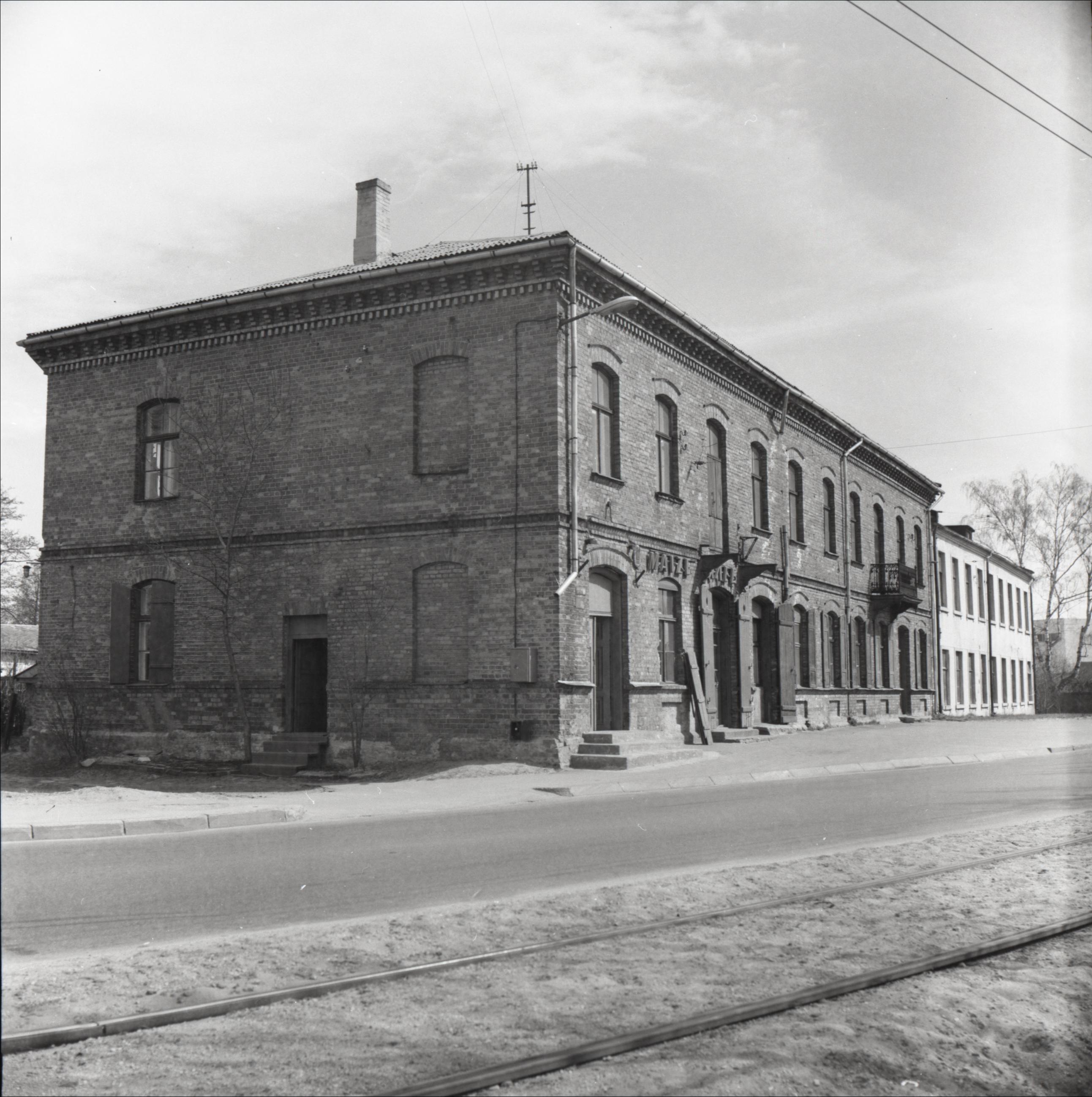Ēka: Skats no dienvidrietumiem, fasādes, 1. stāvā maiznīca, balkons, tramvaja sliedes