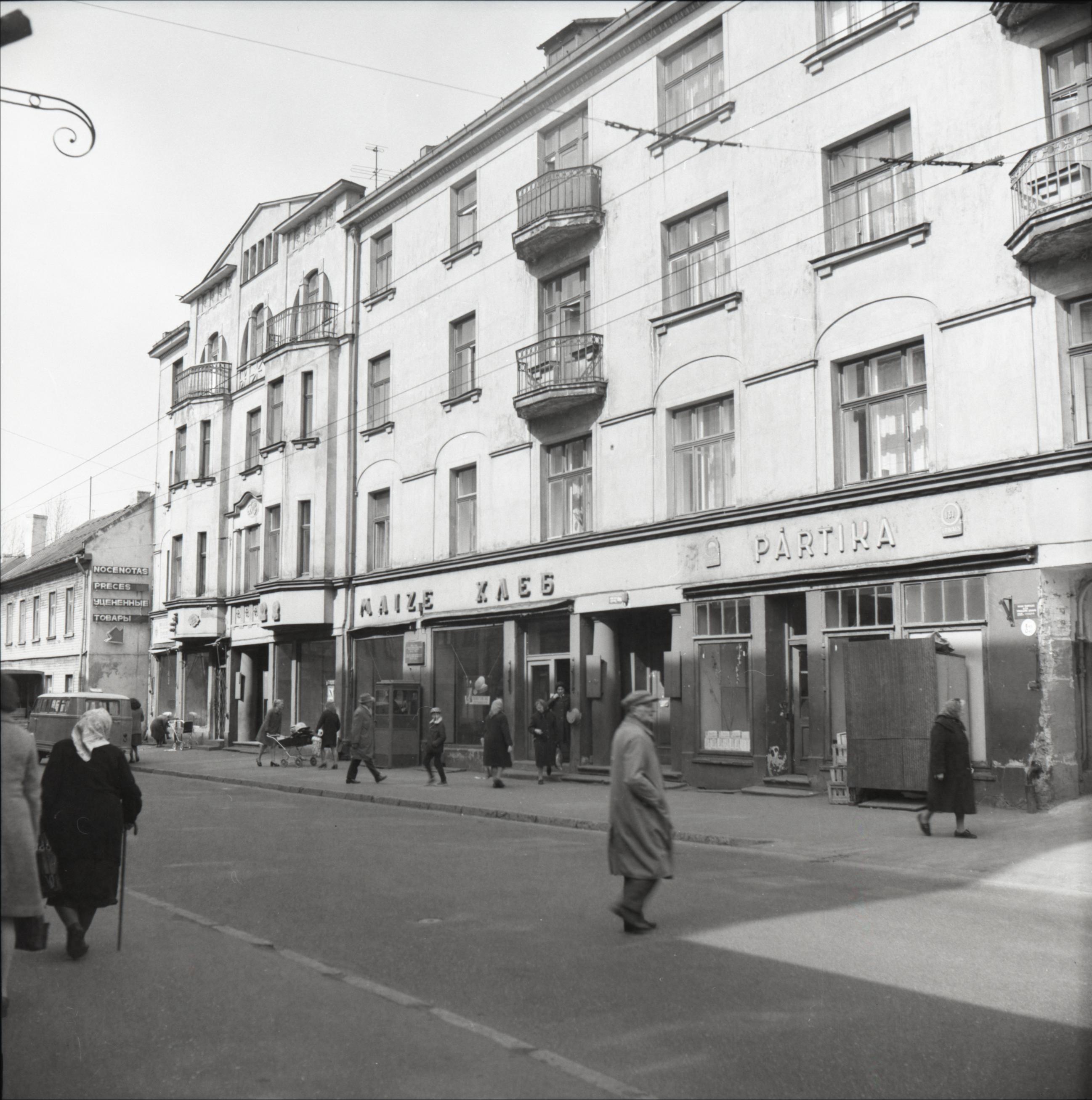Ēka: Fasāde, balkoni, 1. stāvā maiznīca, pārtikas veikals