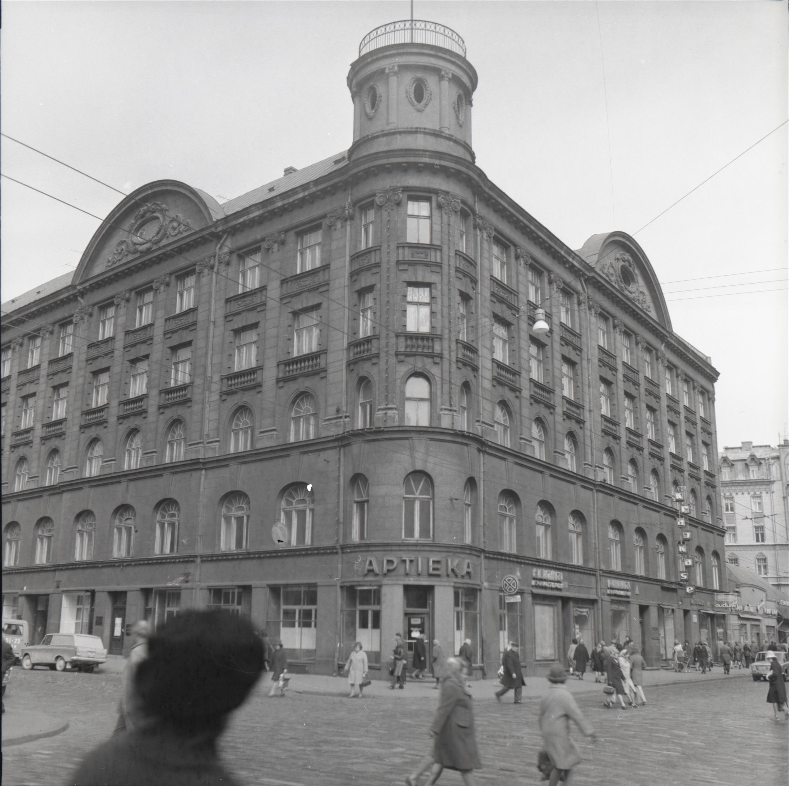 Ēka: Fasādes, skats uz ēkas stūri, aptieka