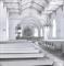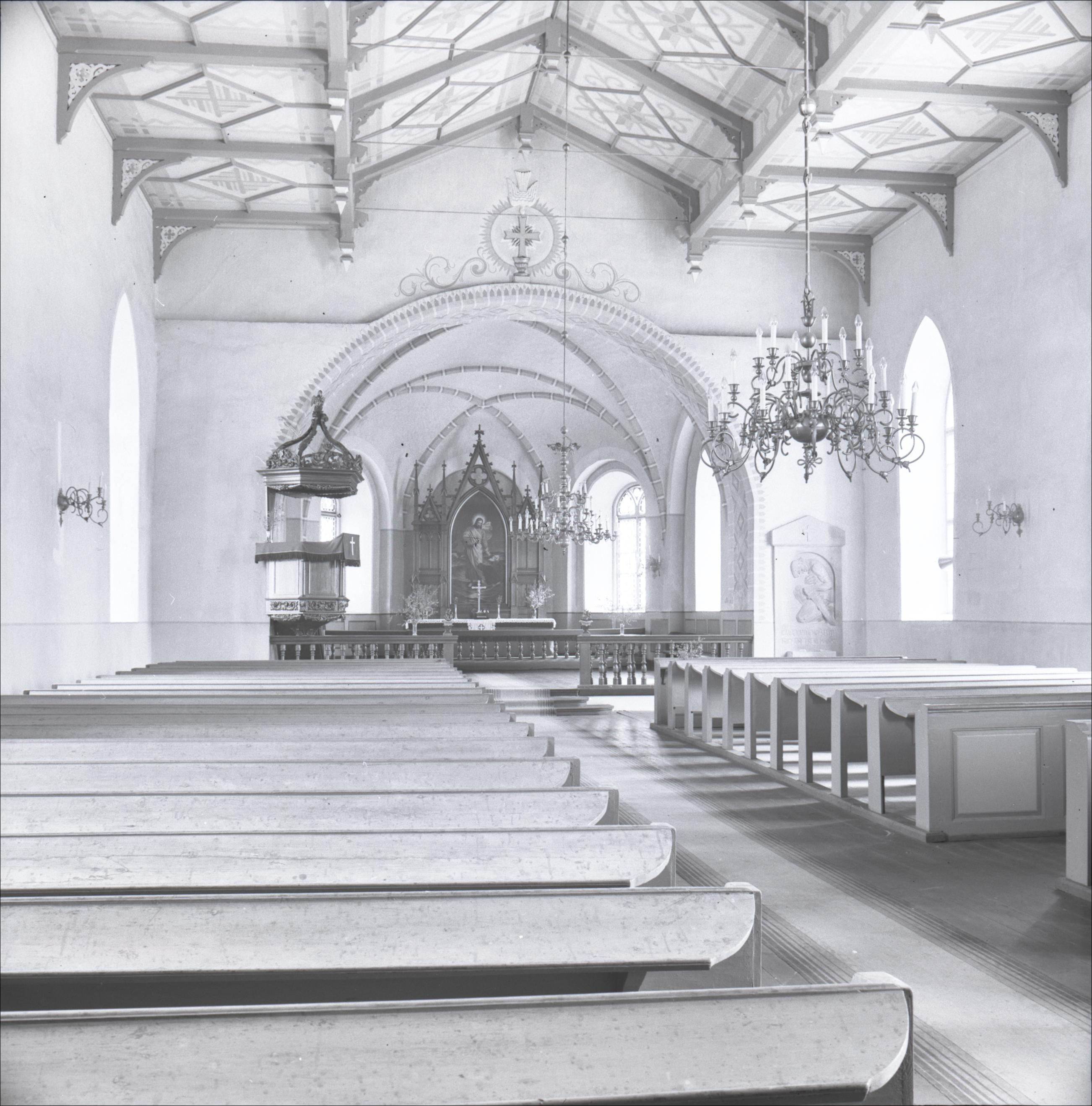 Trikātas baznīca: Skats uz altāri, kancele, lustra, soli, griesti