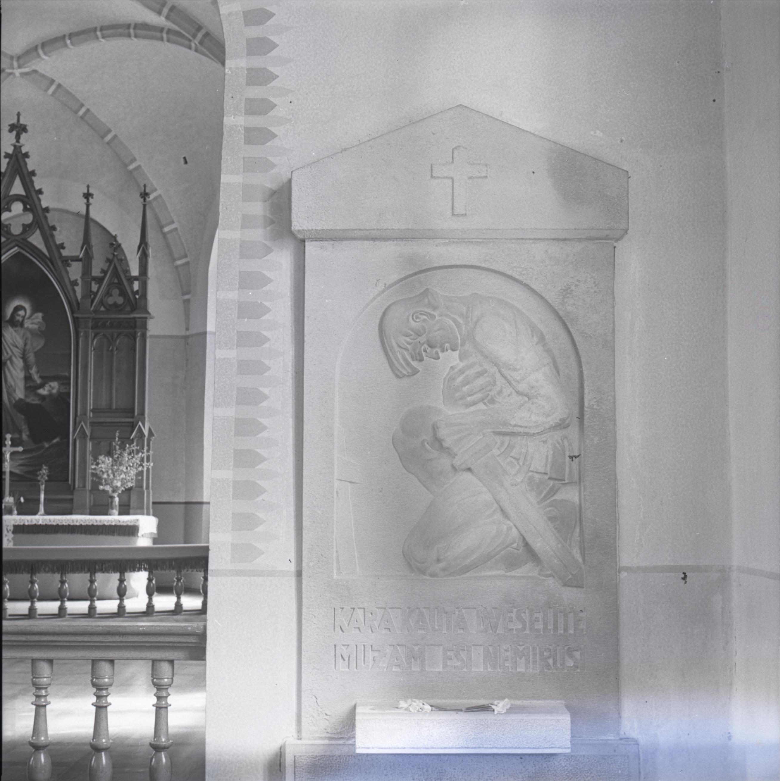 Trikātas baznīca: Piemiņas cilnis, karavīrs ar zobenu, krusts un citāts "Kara kautā dvēselīte mūzam esi nemiris"