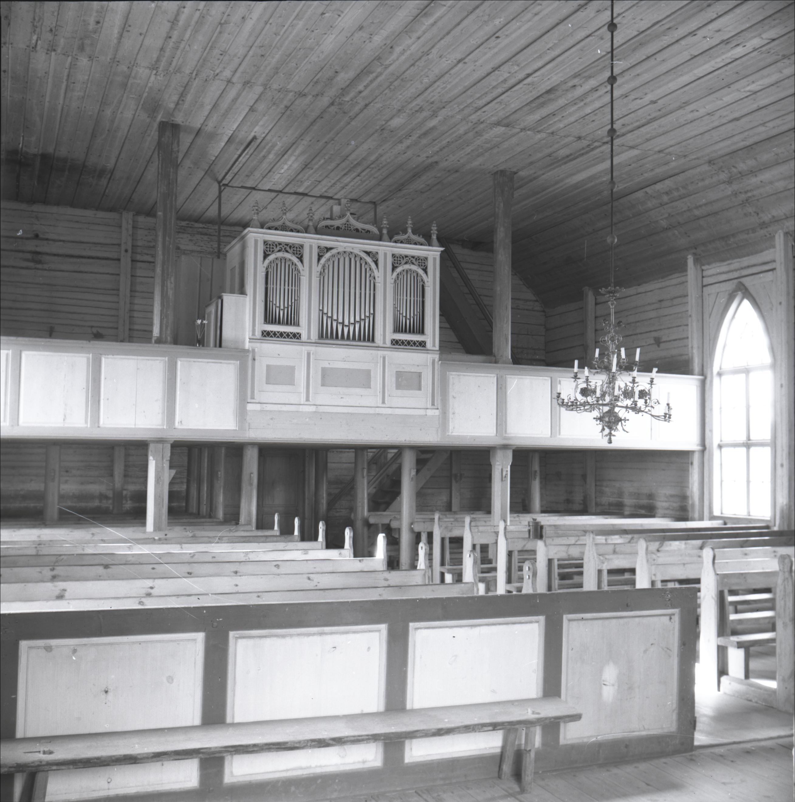 Vijciema baznīca: Skats uz ērģeļu luktu, ērģeles, lustra, soli