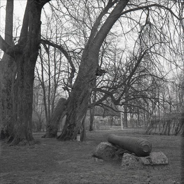 Puzenieku muižas apbūve: 17. gs. lielgabals, skats no aizmugures, koki