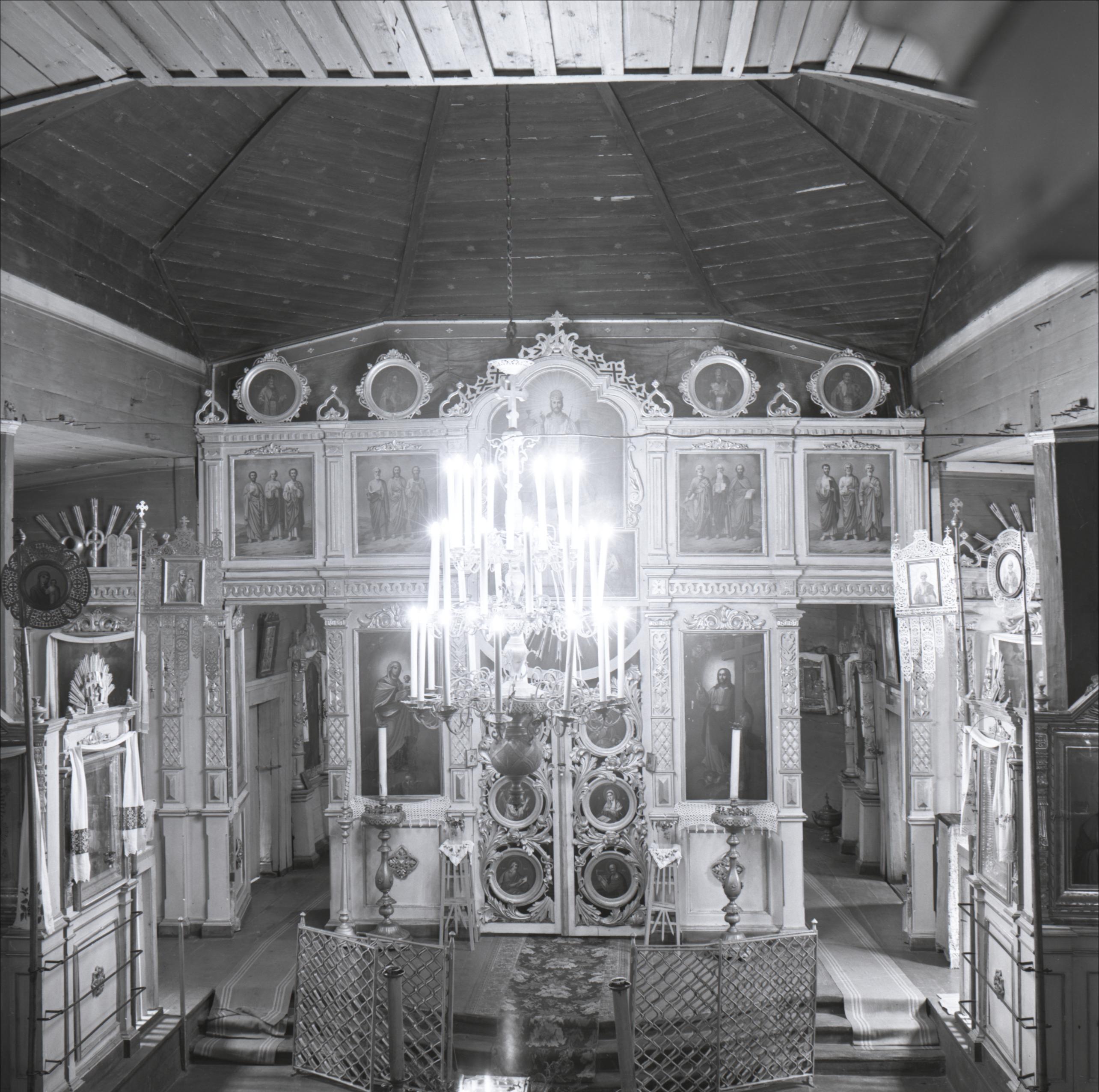 Lauderu pareizticīgo baznīca ar žogu un vārtiem: Altāris, svētbildes, svečturi, lustra
