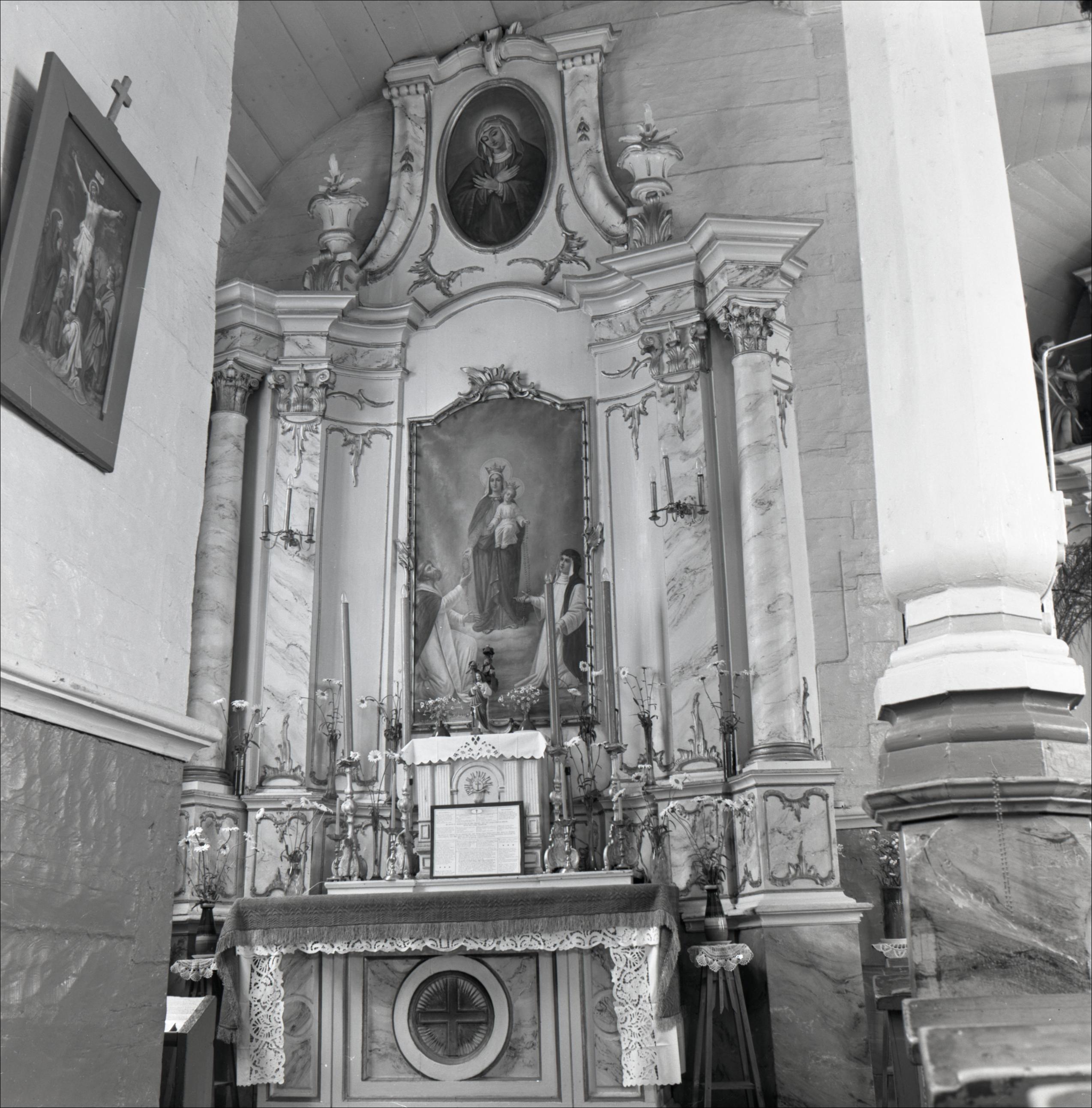 Malnavas katoļu baznīca ar kapelām (3) un žogu: Sānu altāris, glezna, mensa, svečturi