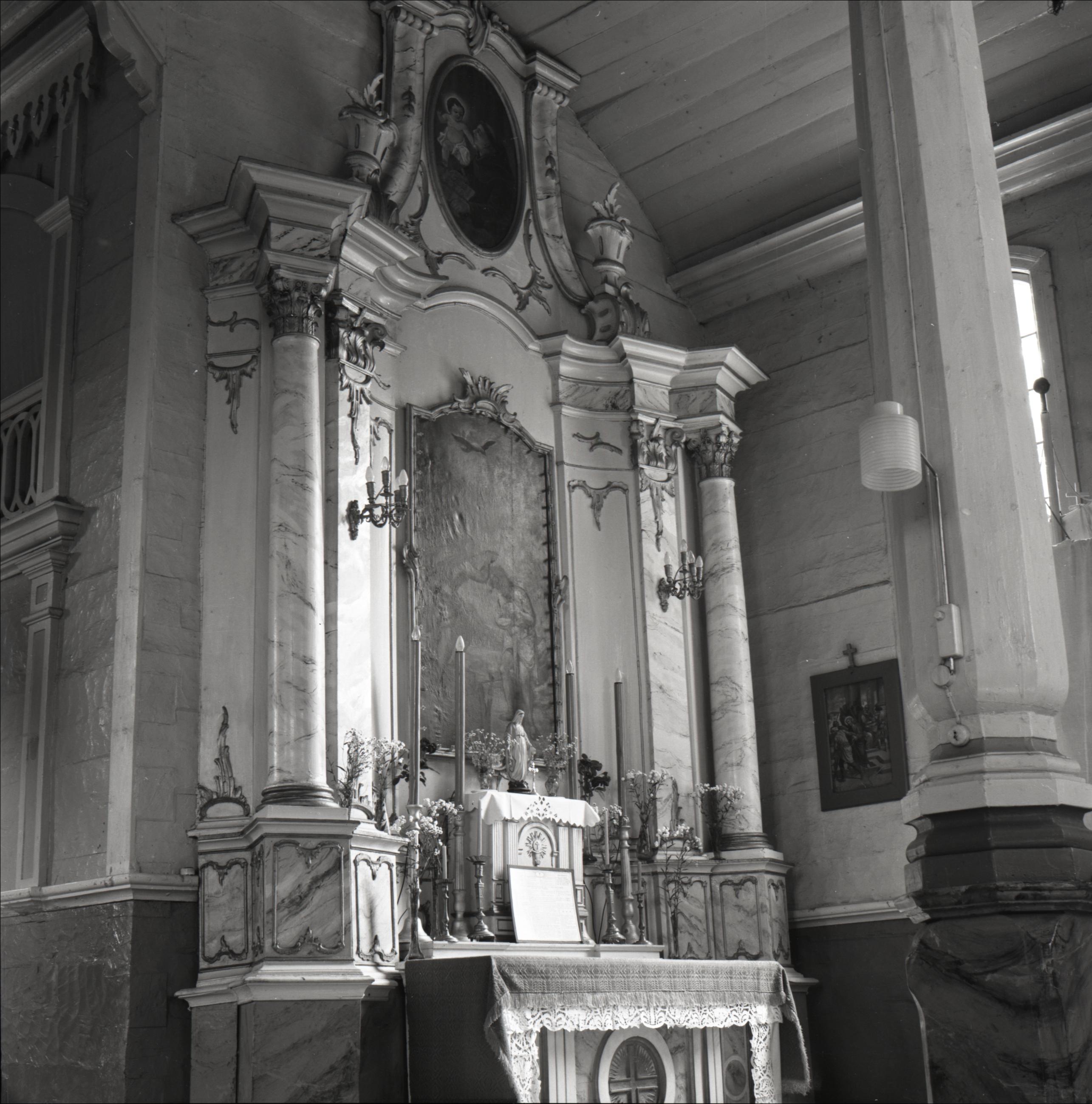 Malnavas katoļu baznīca ar kapelām (3) un žogu: Sānu altāris, glezna, mensa, svečturi
