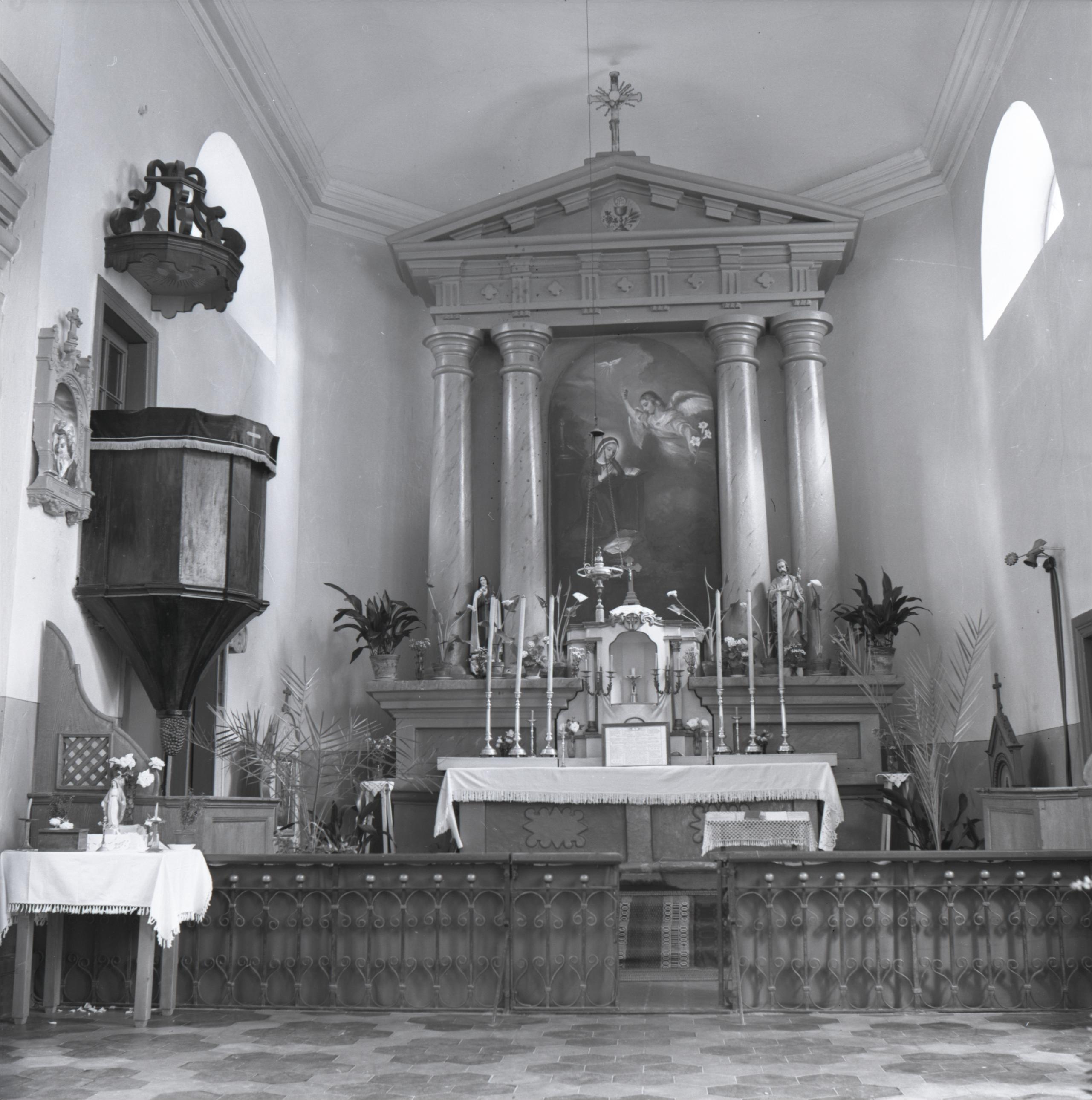 Pušmucovas katoļu baznīca ar žogu un vārtiem: Altāris, kancele, mensa, svečturi, altārglezna