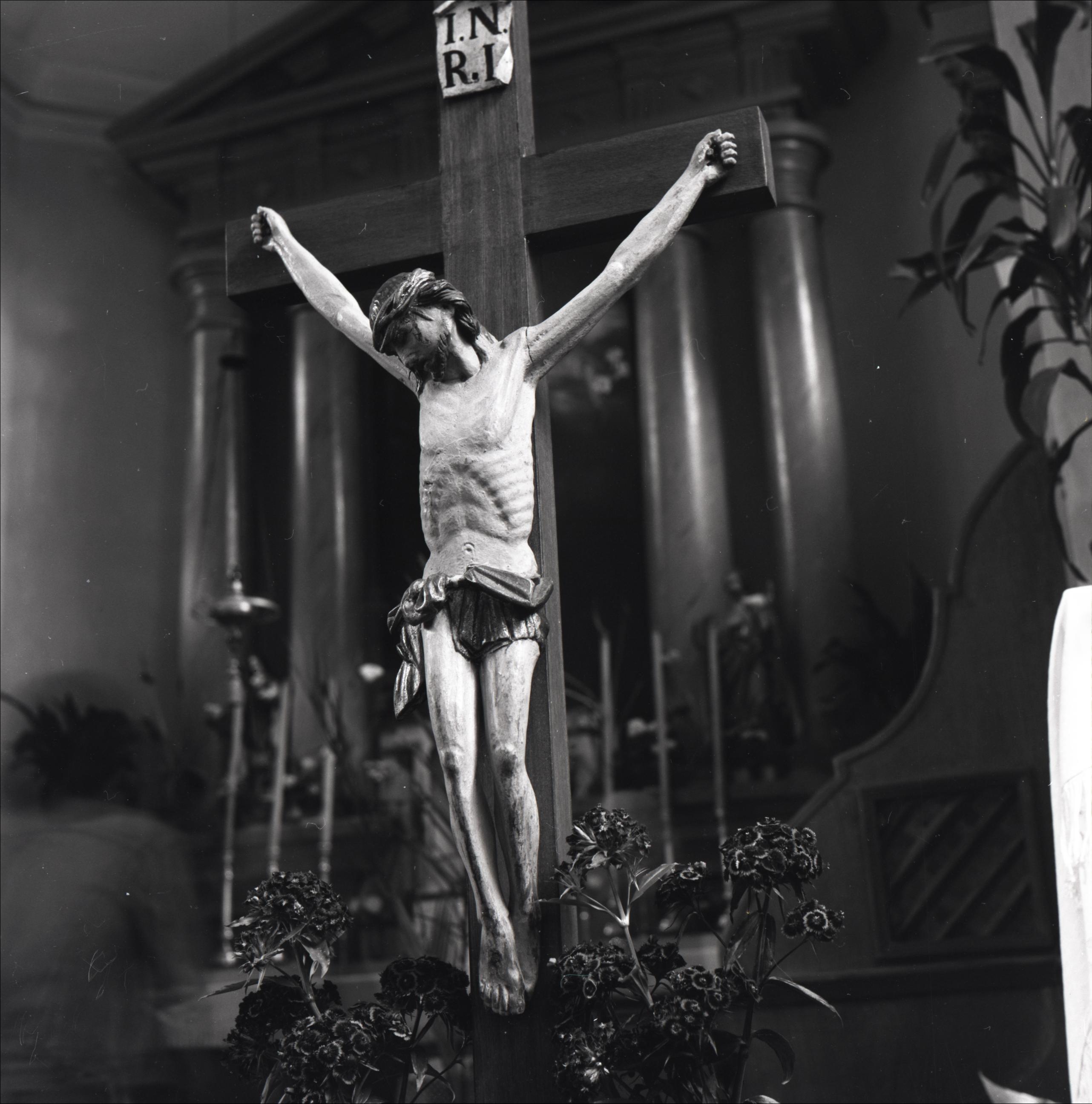 Pušmucovas katoļu baznīca ar žogu un vārtiem: Krucifikss