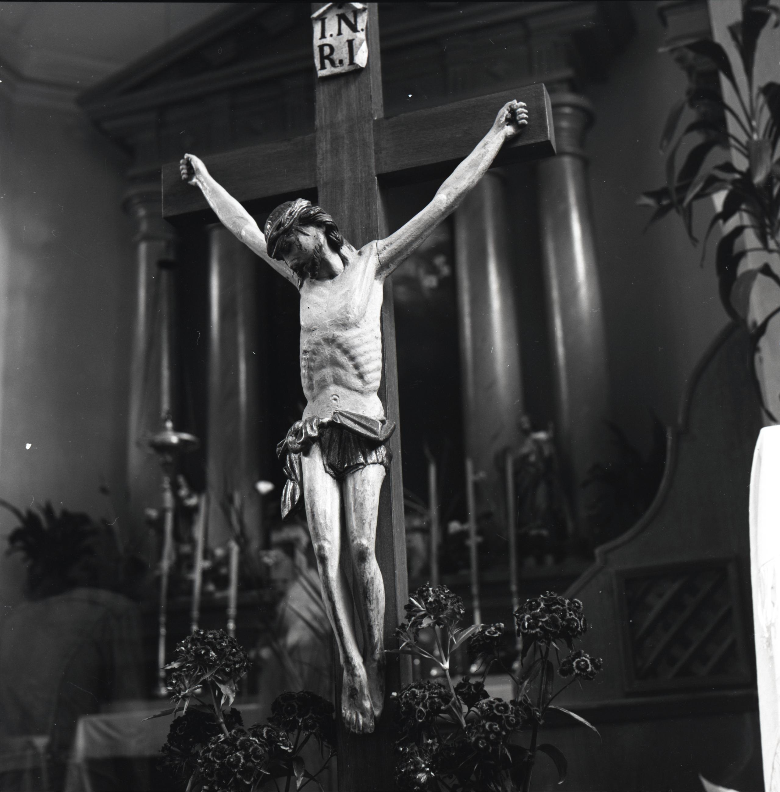 Pušmucovas katoļu baznīca ar žogu un vārtiem: Krucifikss