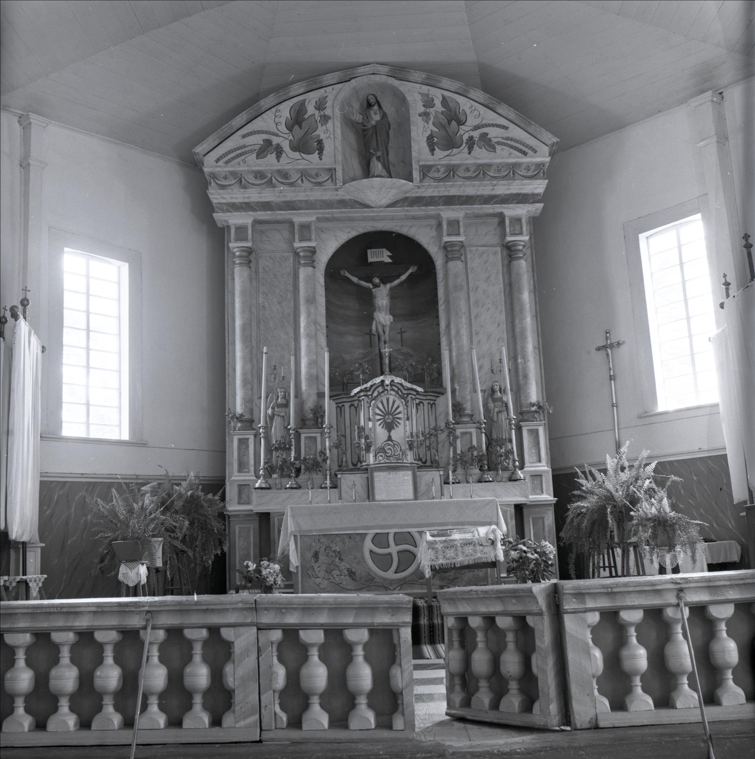 Stiglovas katoļu baznīca: Altāris, krucifikss, sētiņa, svečturi, telpaugi, logi