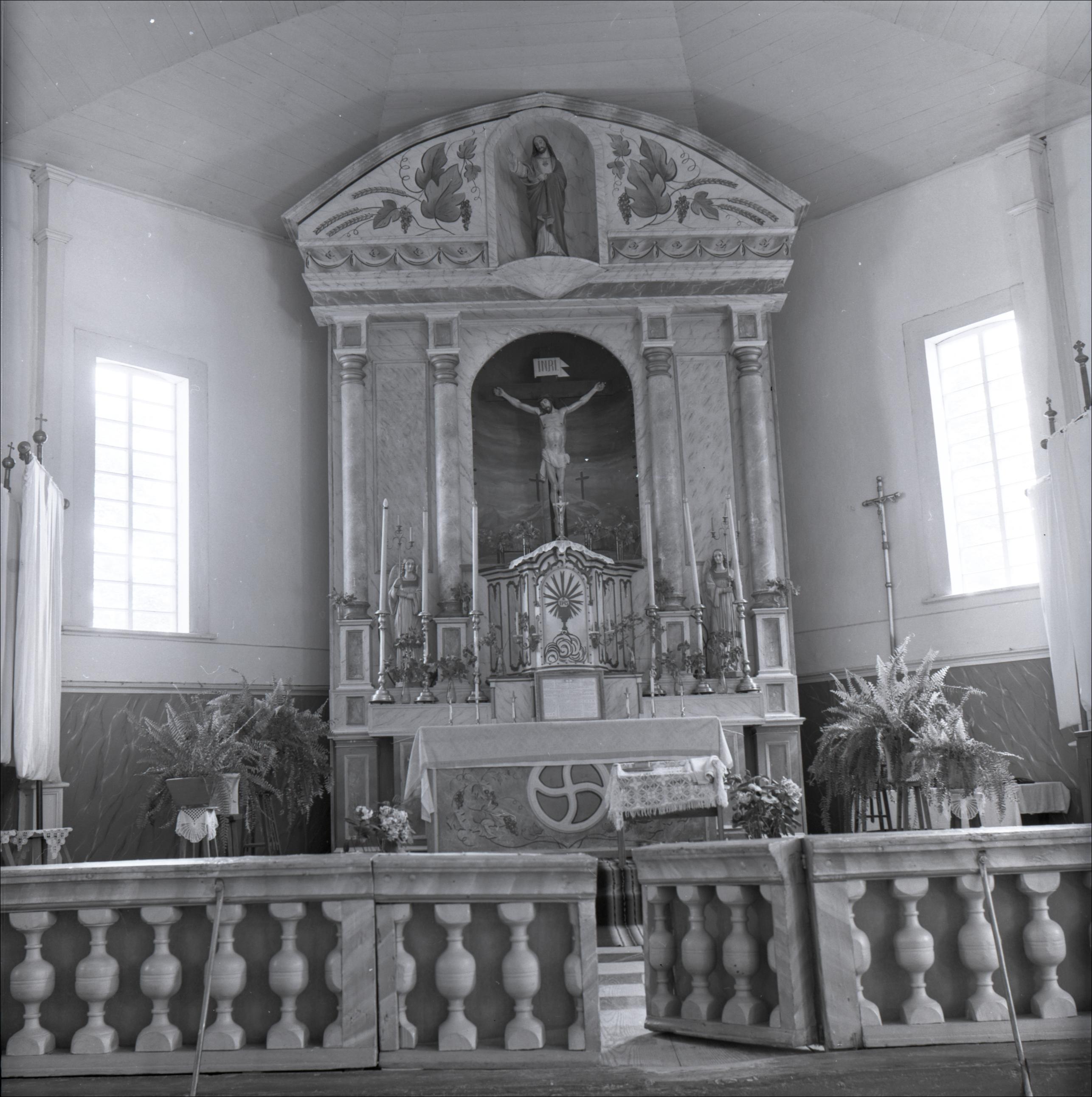 Stiglovas katoļu baznīca: Altāris, krucifikss, sētiņa, svečturi, telpaugi, logi