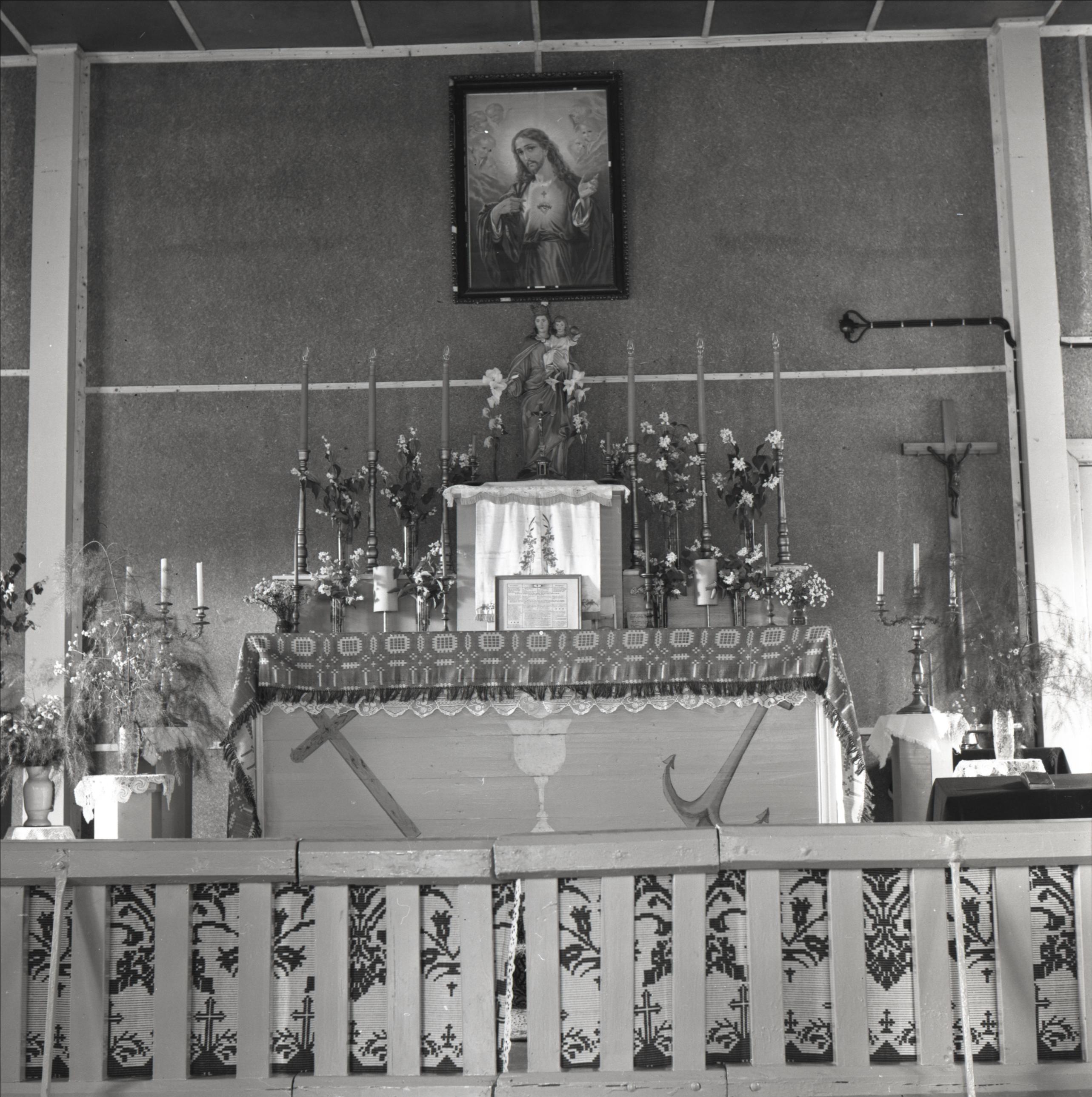 Mežvidu katoļu baznīca: Altāris, sētiņa, altārglezna, mensa, svečturi