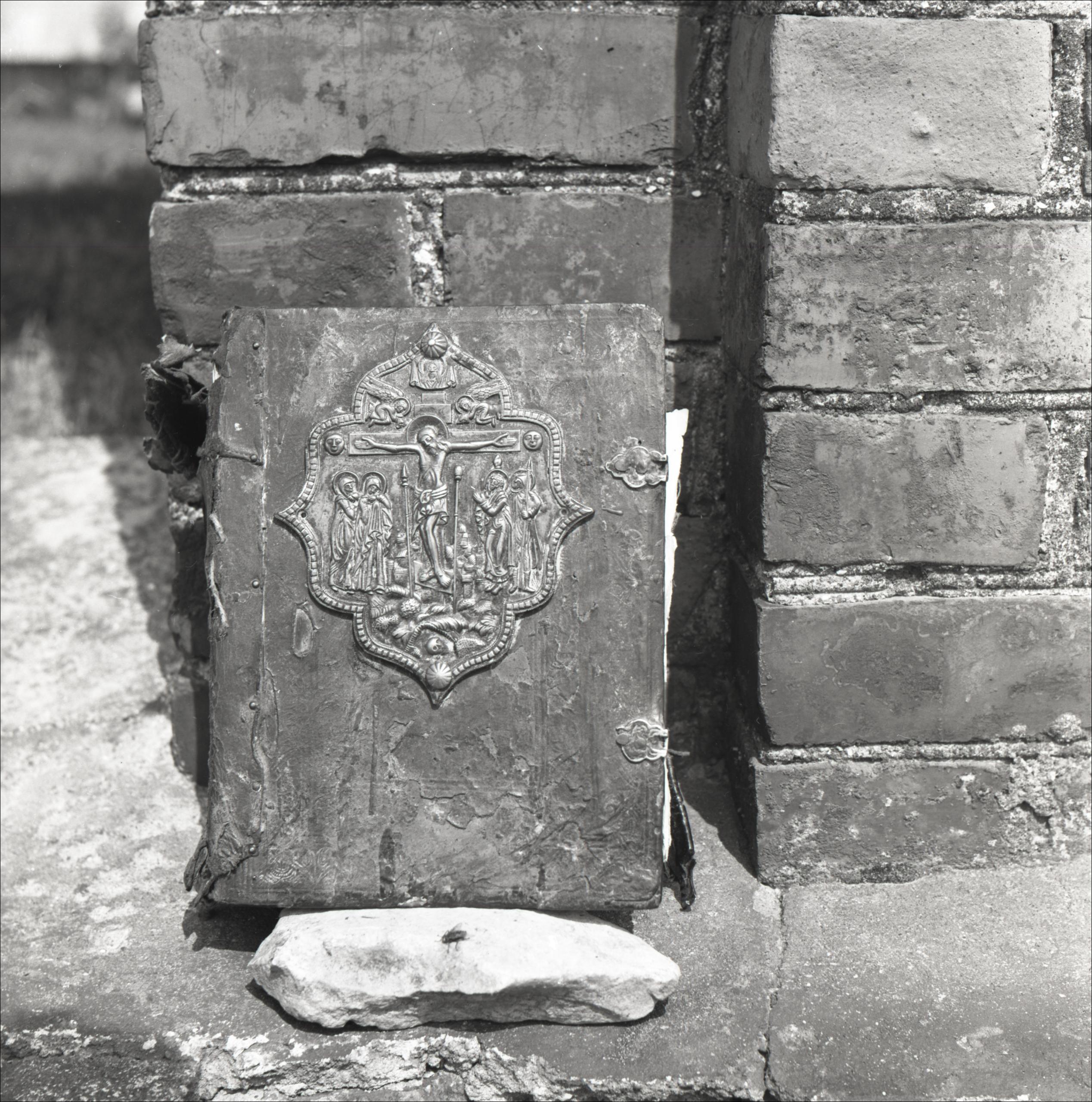 Bližņevas vecticībnieku lūgšanu nams: Grāmatas vāks – iegravēta Jēzus krustā sišana