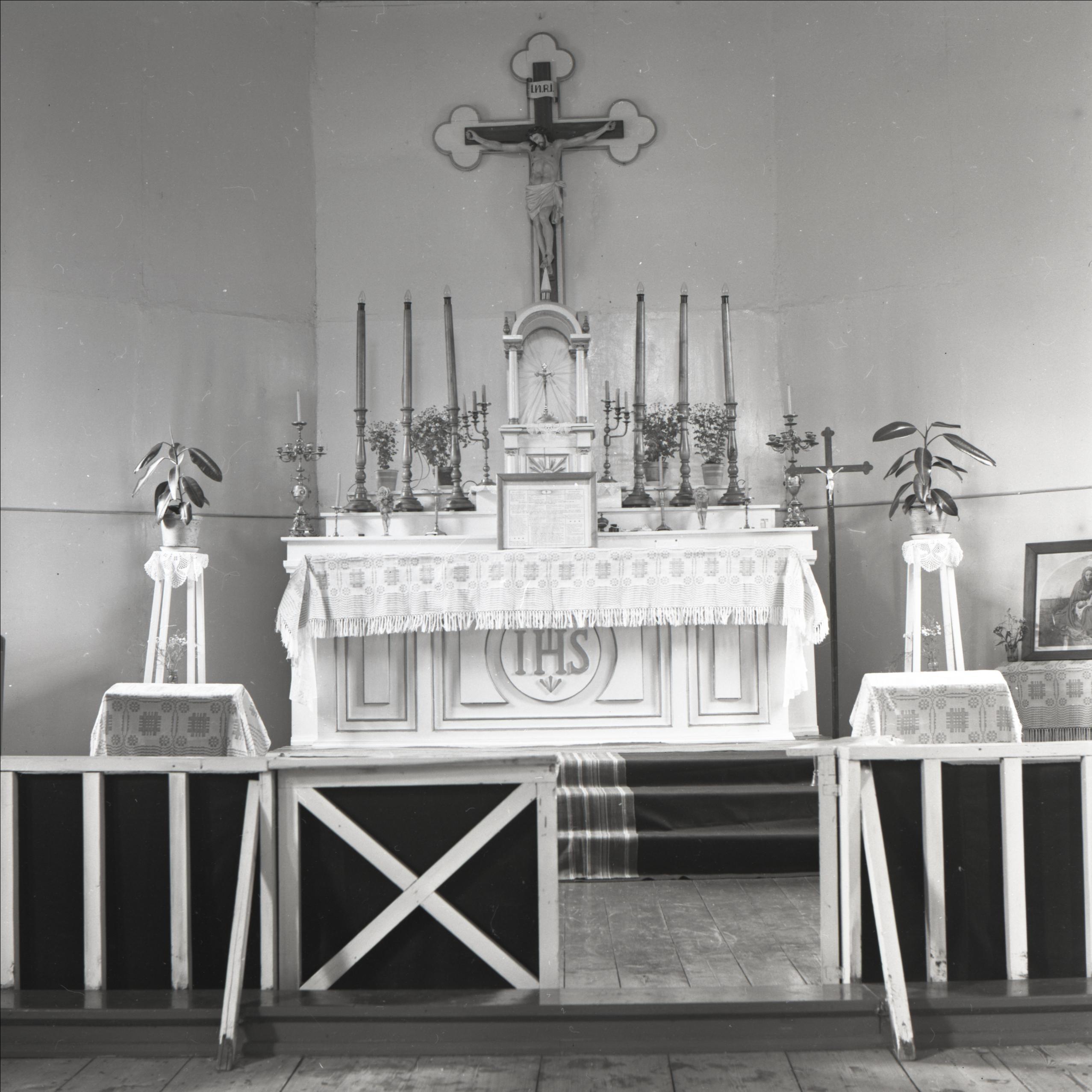 Ruskulovas Katoļu baznīca: Altāris, mensa, krucifikss, svečturi, telpaugi, glezna, sētiņa