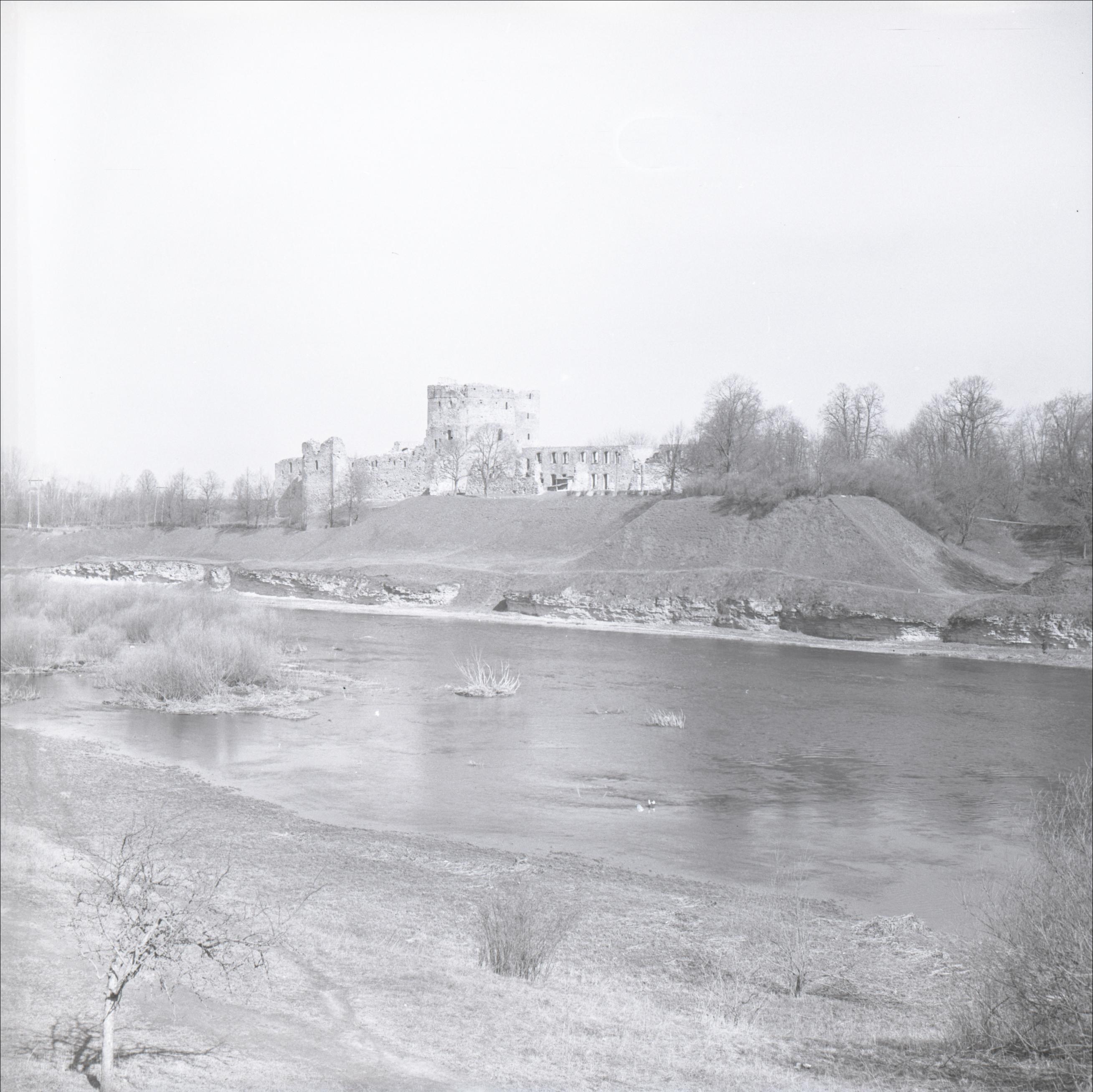 Bauskas pilsdrupas ar parku: Skats uz pilskalnu, redzama upe