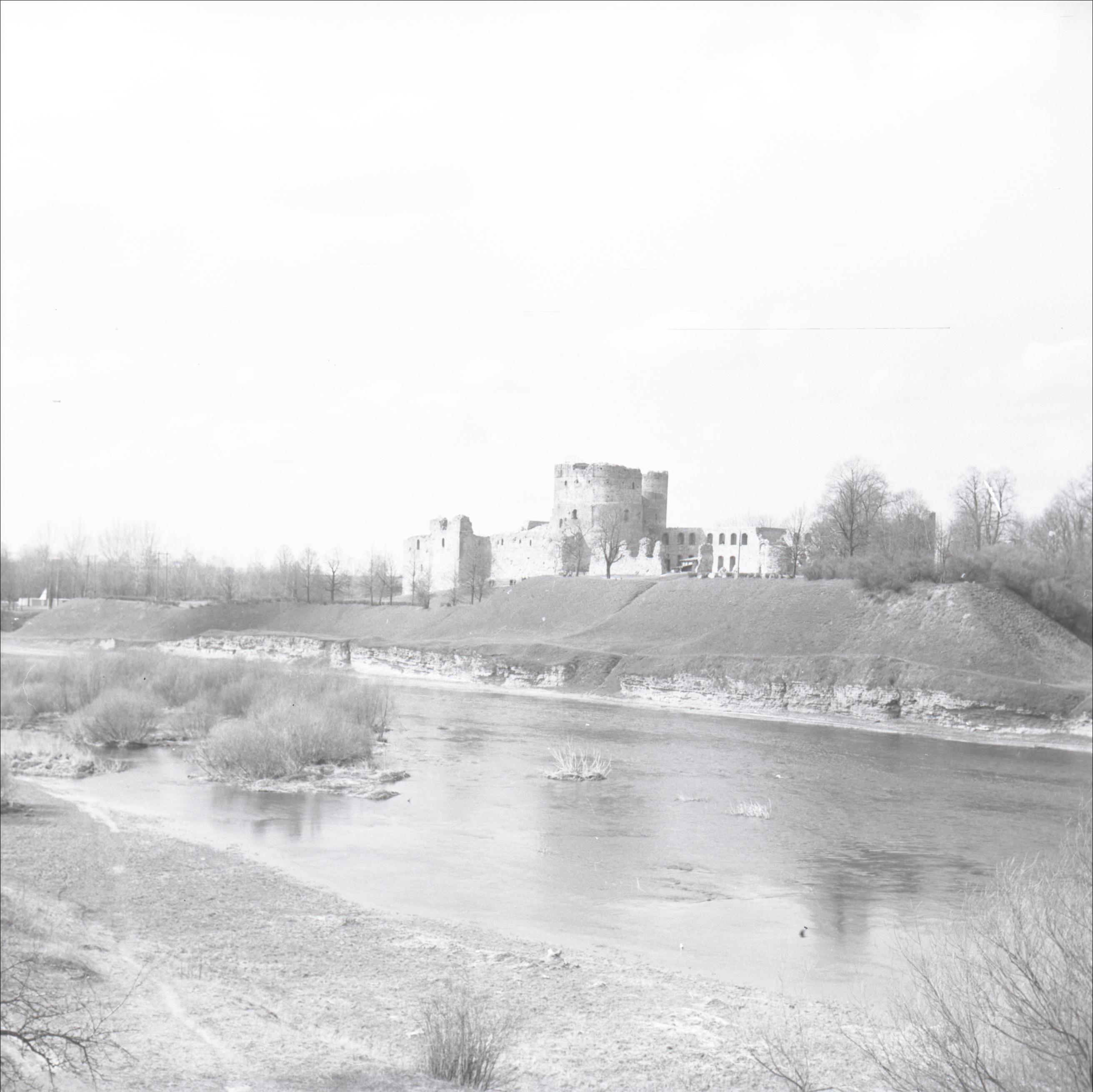 Bauskas pilsdrupas ar parku: Skats uz pilskalnu, redzama upe