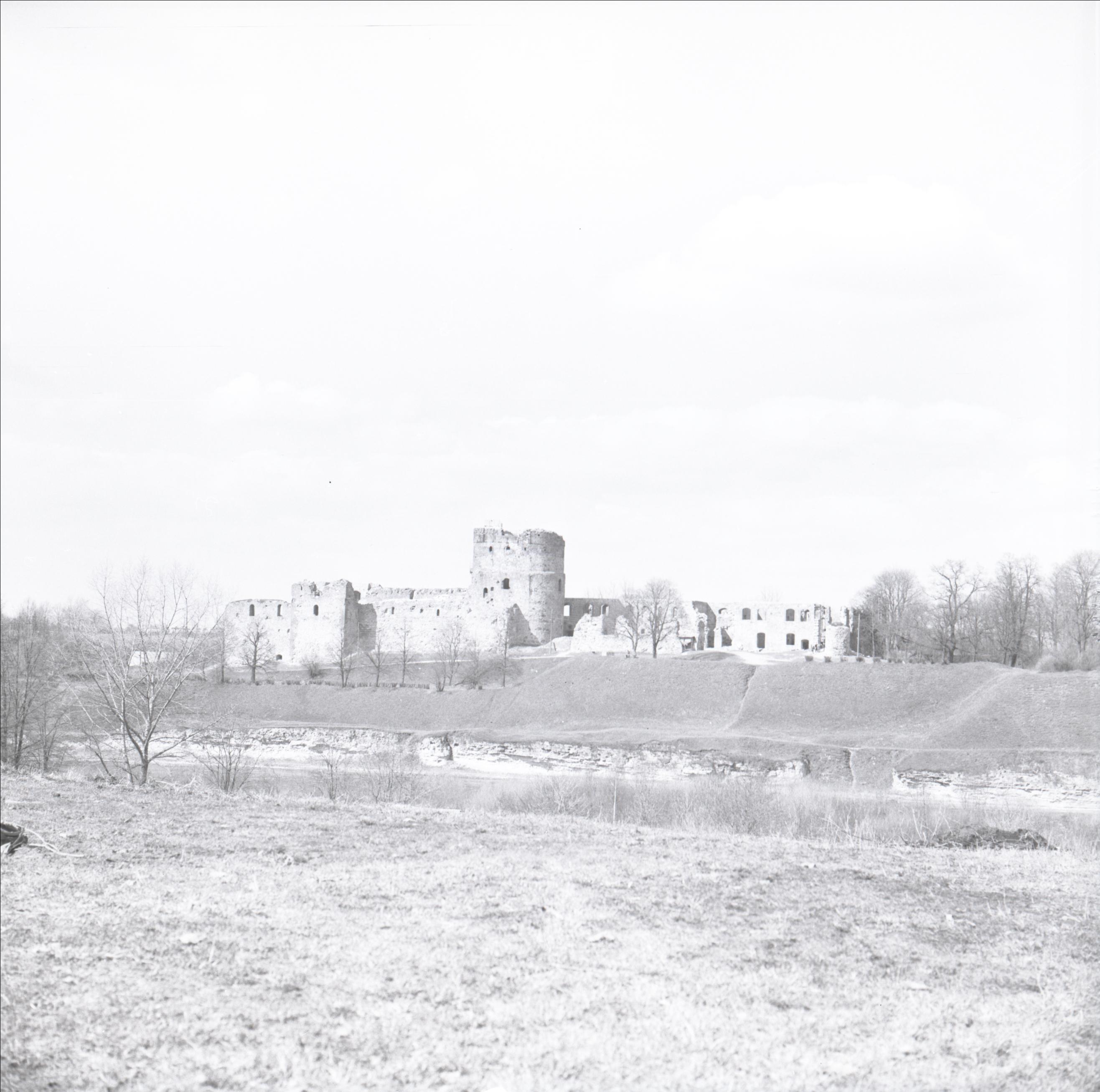 Bauskas pilsdrupas ar parku: Skats uz pilskalnu, redzama upe