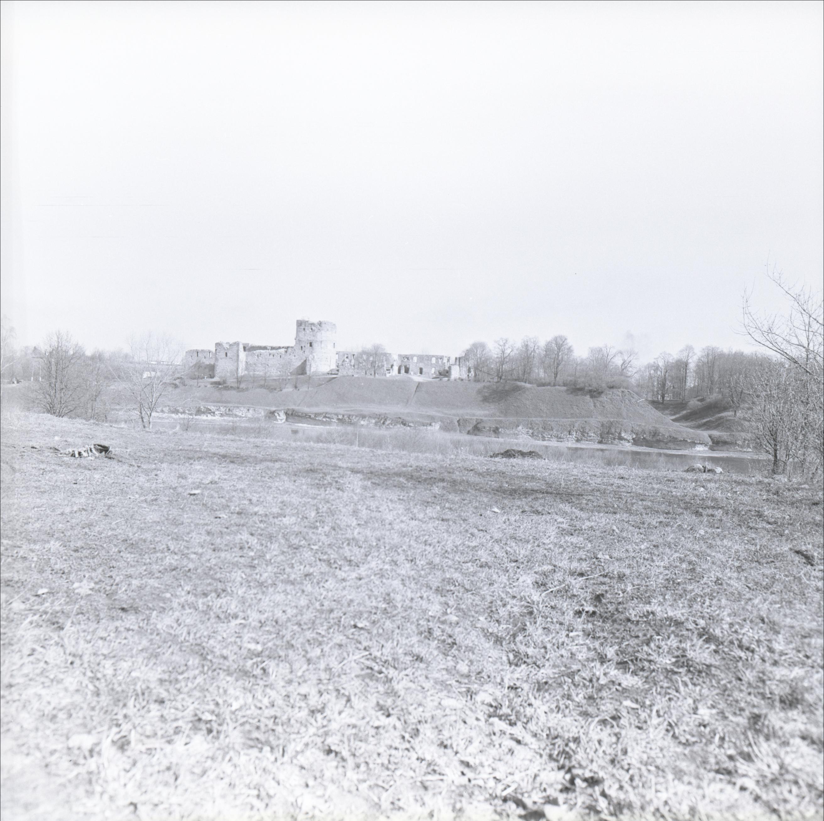 Bauskas pilsdrupas ar parku: Skats uz pilskalnu, redzama upe