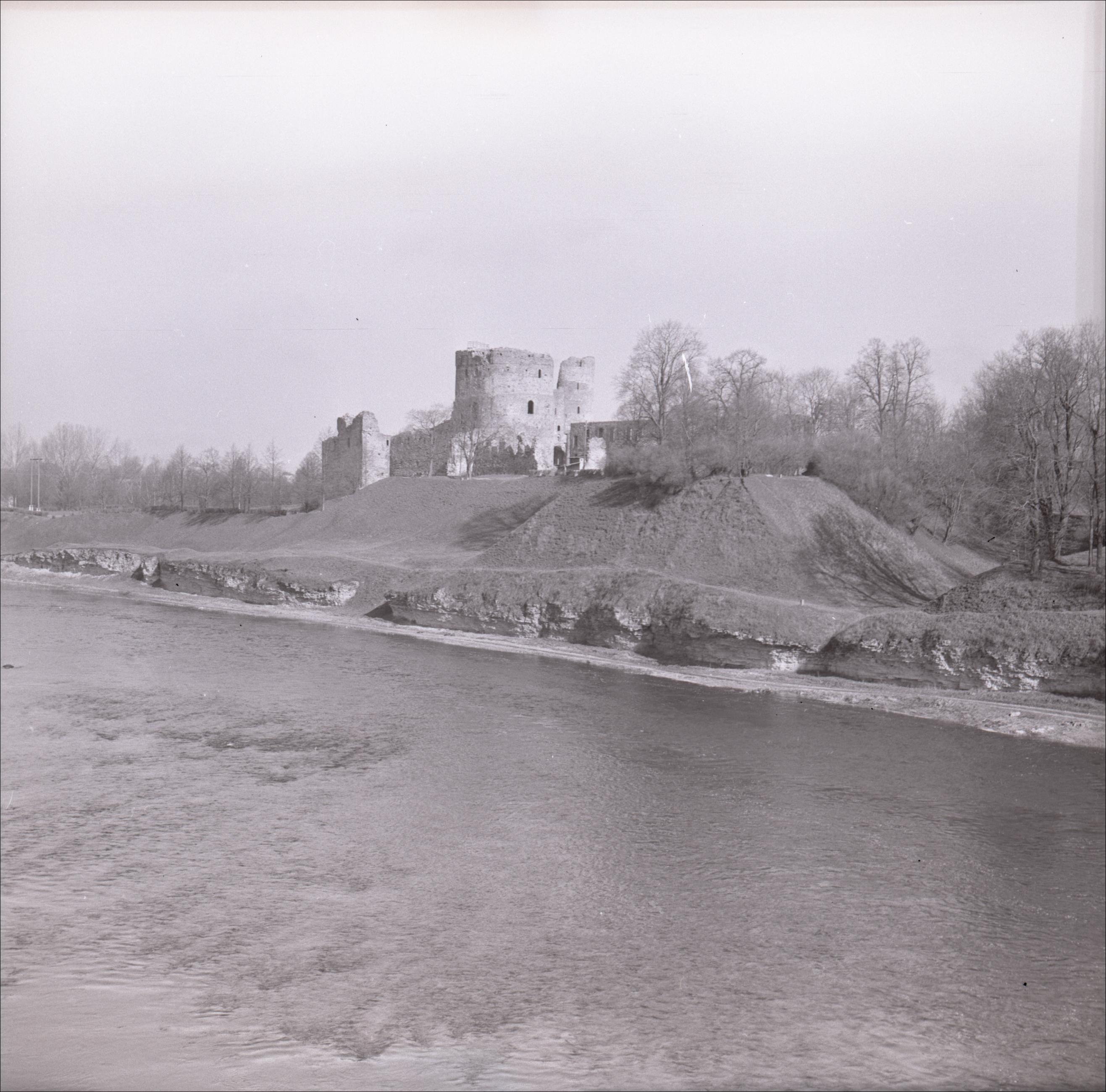 Bauskas pilsdrupas ar parku: Skats uz pilskalnu no tilta, redzama Mūsa