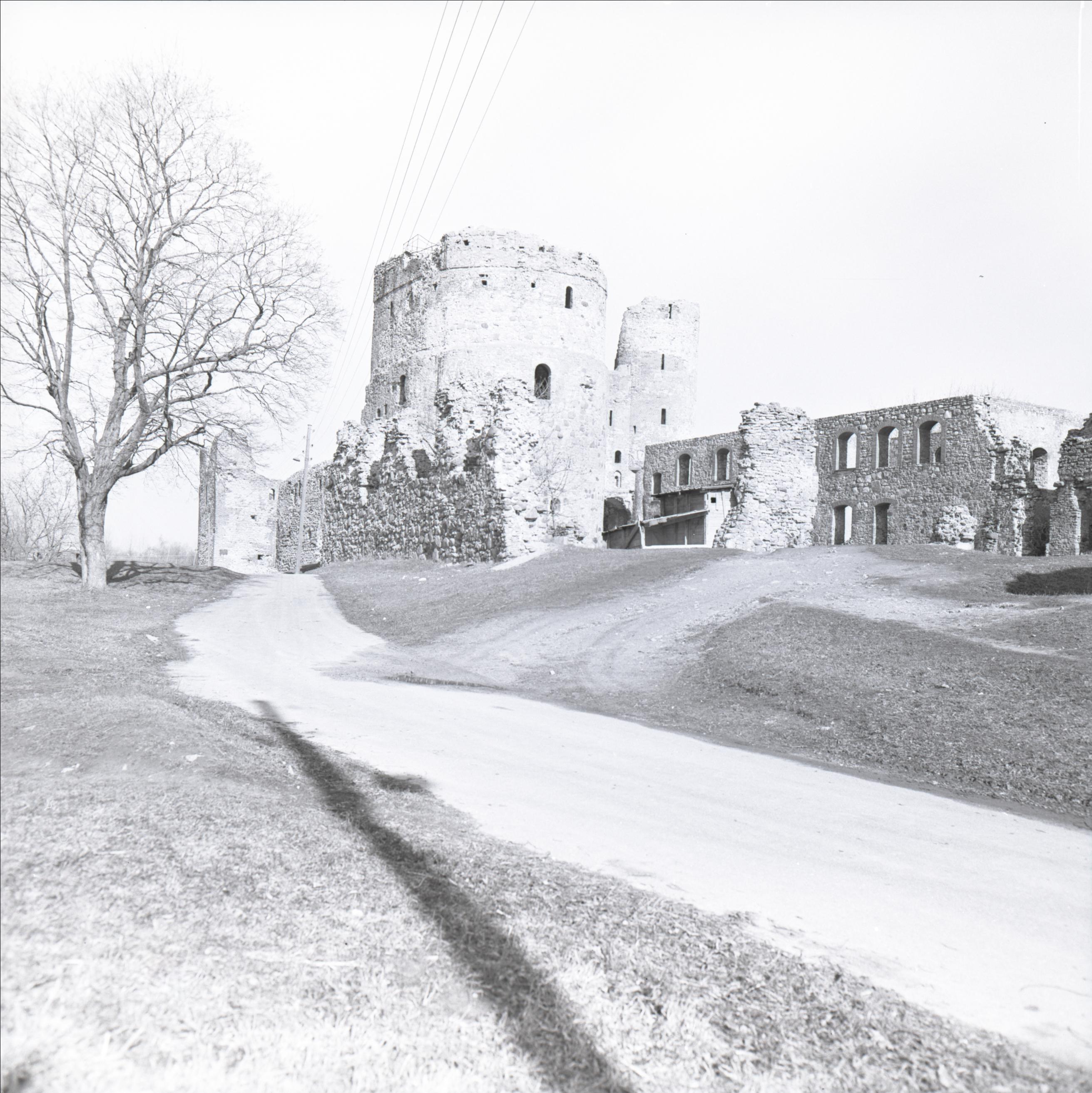 Bauskas pilsdrupas ar parku: Tornis un siena, piebraucamais ceļš, elektrības stabs, koks