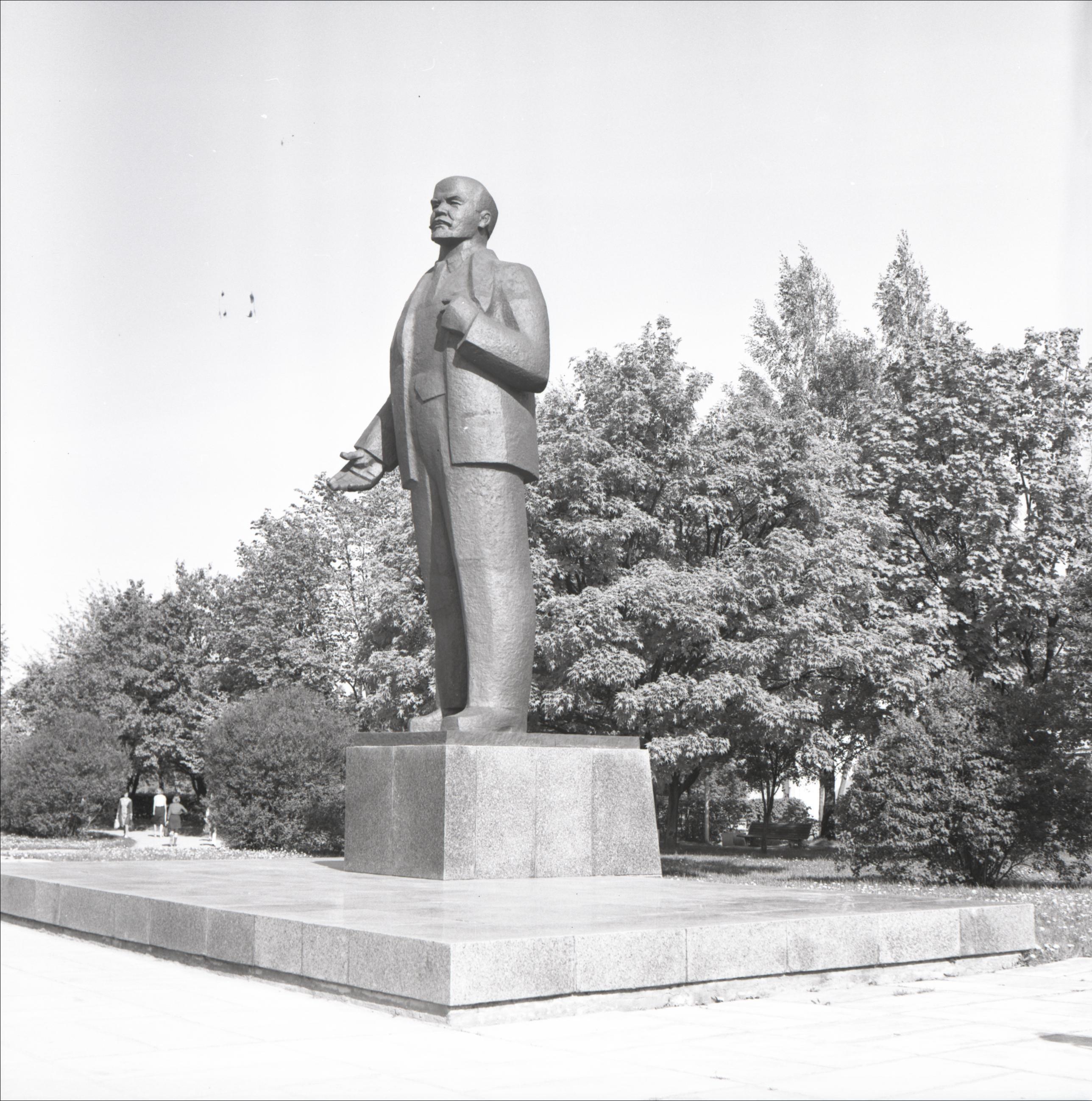 Ļeņina piemineklis: Skats uz pieminekli, fonā koki, krūmi, sievietes