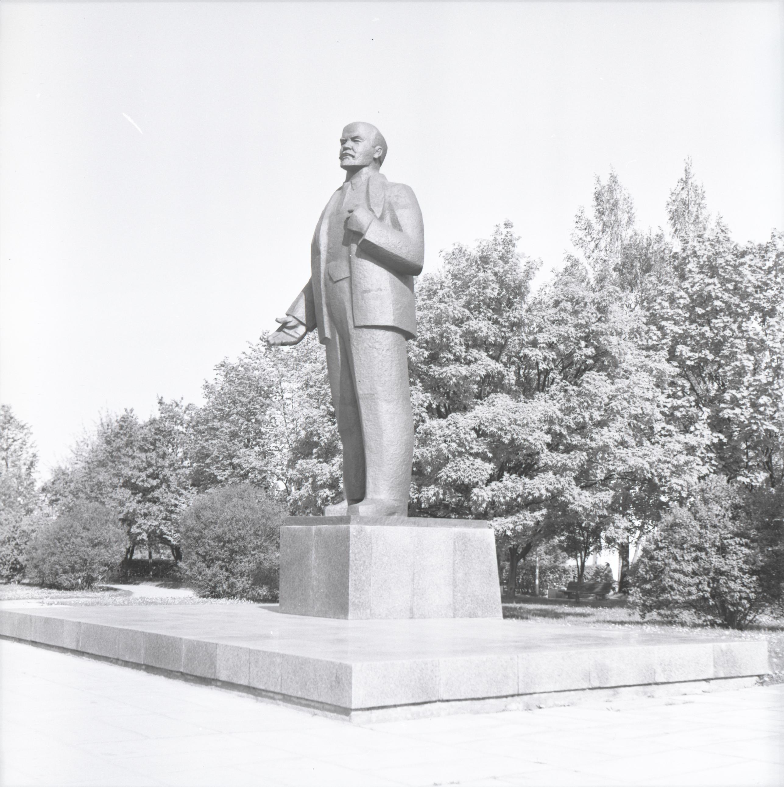Ļeņina piemineklis: Skats uz pieminekli, fonā koki, krūmi