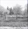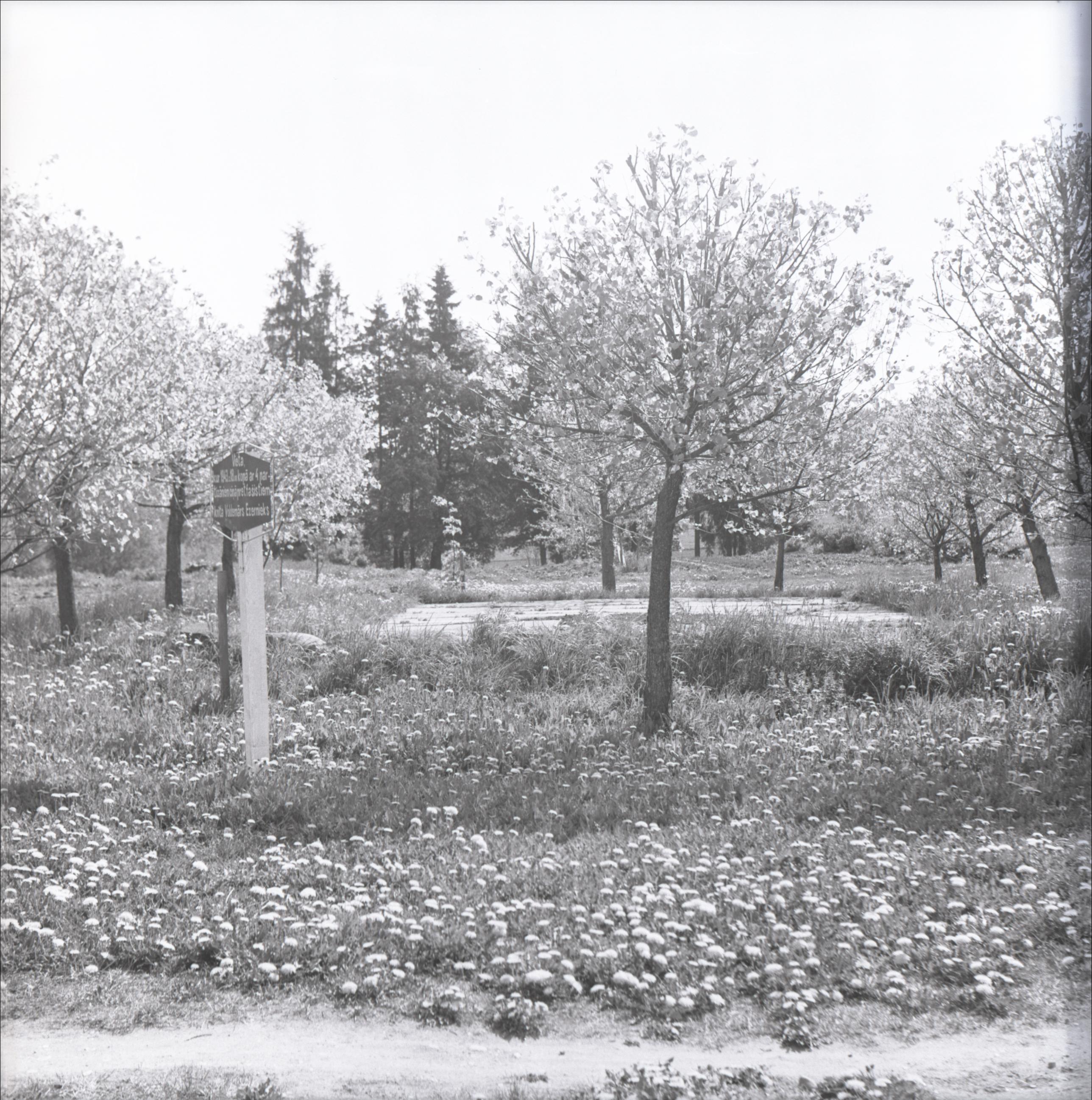 Vieta, kur krita Voldemārs Ezernieks: Piemiņas plāksne, koki, fonā saimniecības ēkas