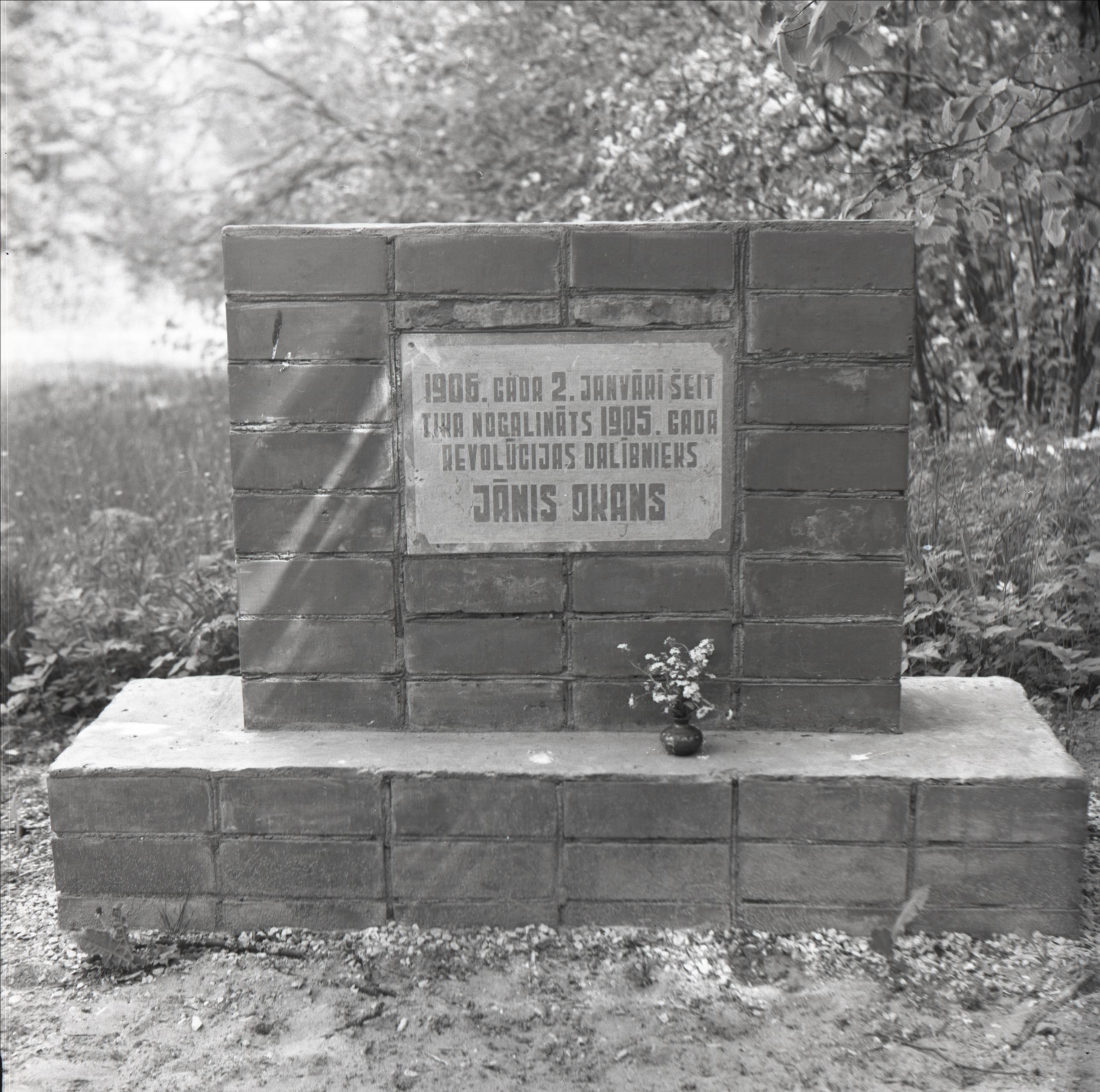 Vieta, kur 1906. gadā nošauts Jānis Okans: Kapa piemienklis, pie tā ziedu vāze. Jānis Okans nogaliāts 1906. gada 2. janvārī