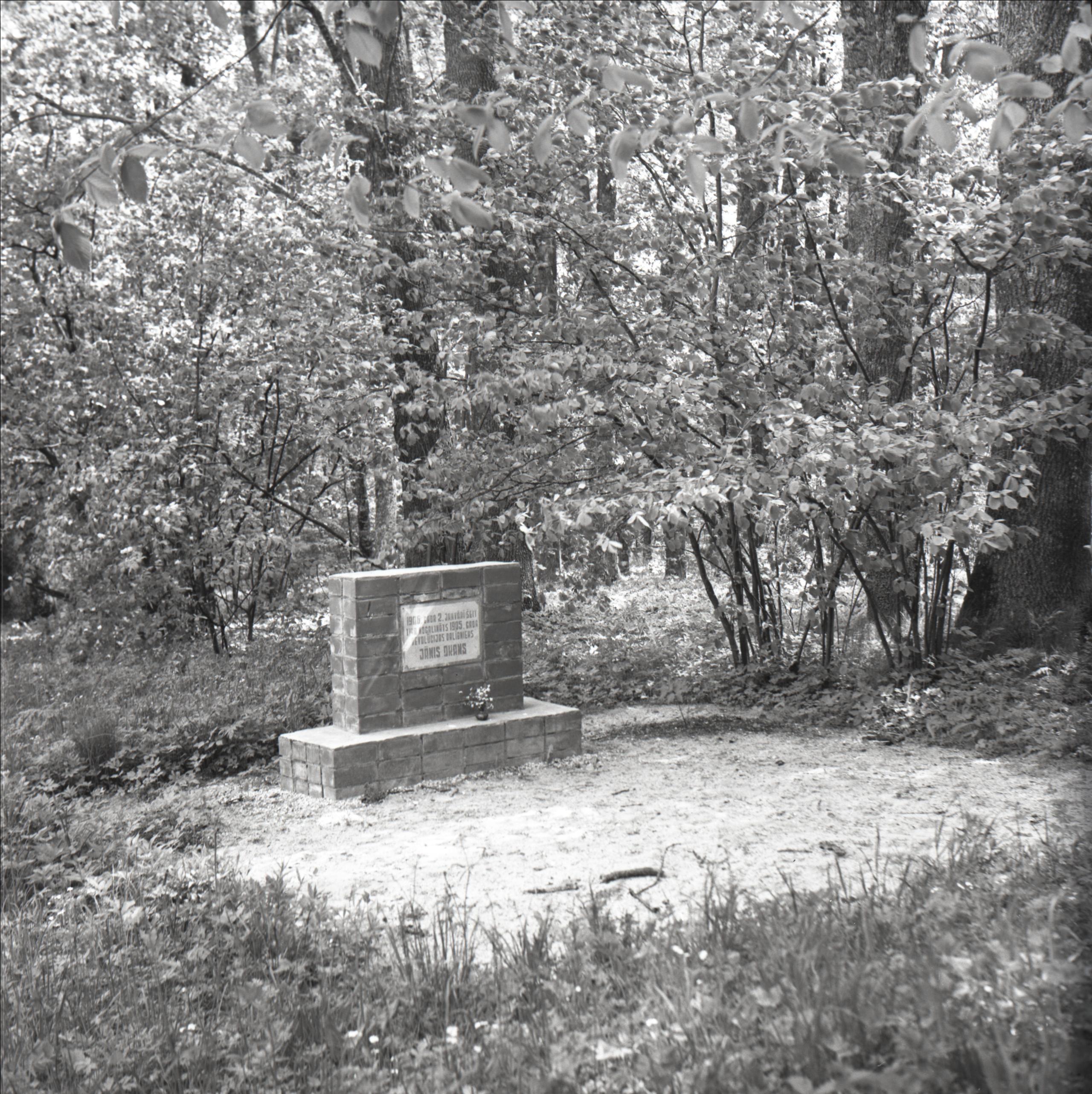 Vieta, kur 1906. gadā nošauts Jānis Okans: Kapa piemienklis, pie tā ziedu vāze, kapa vieta ar smiltīm, fonā koki, krūmi. Jānis Okans nogalināts 1906. gada 2. janvārī