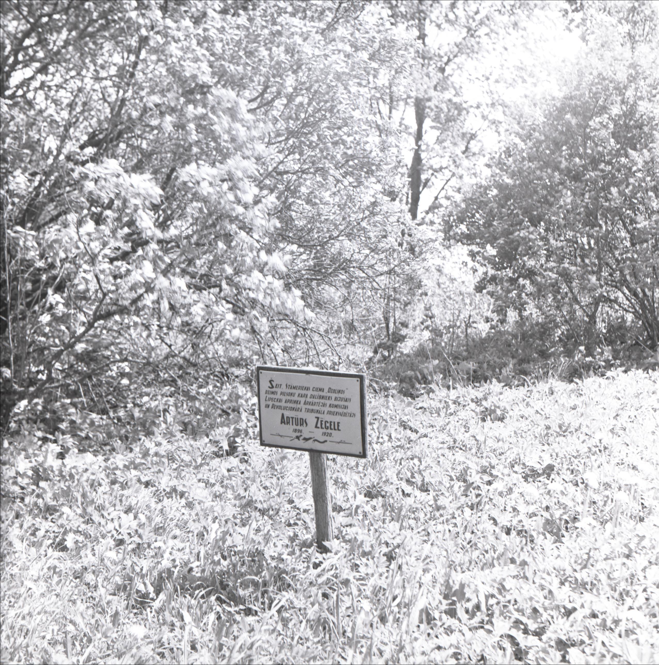 Artūra Zēģeles dzimtās mājas: Plāksne piestiprināta pie mieta, egļu mežs, fonā koki, krūmi. Artūrs Zēģele (1896-1920)
