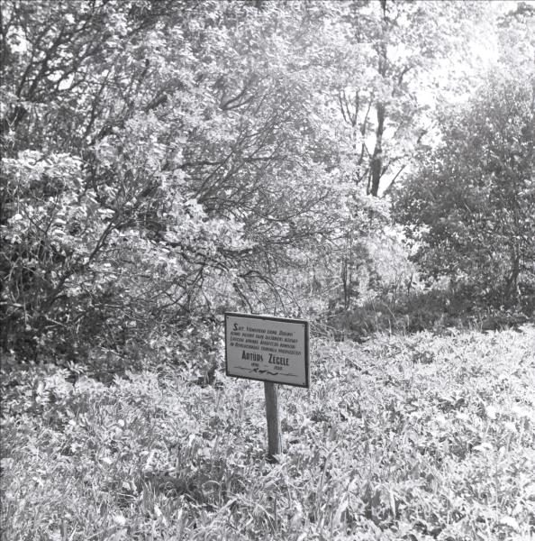 Artūra Zēģeles dzimtās mājas: Plāksne piestiprināta pie mieta, fonā egļu mežs, koki, krūmi. Artūrs Zēģele (1896-1920)