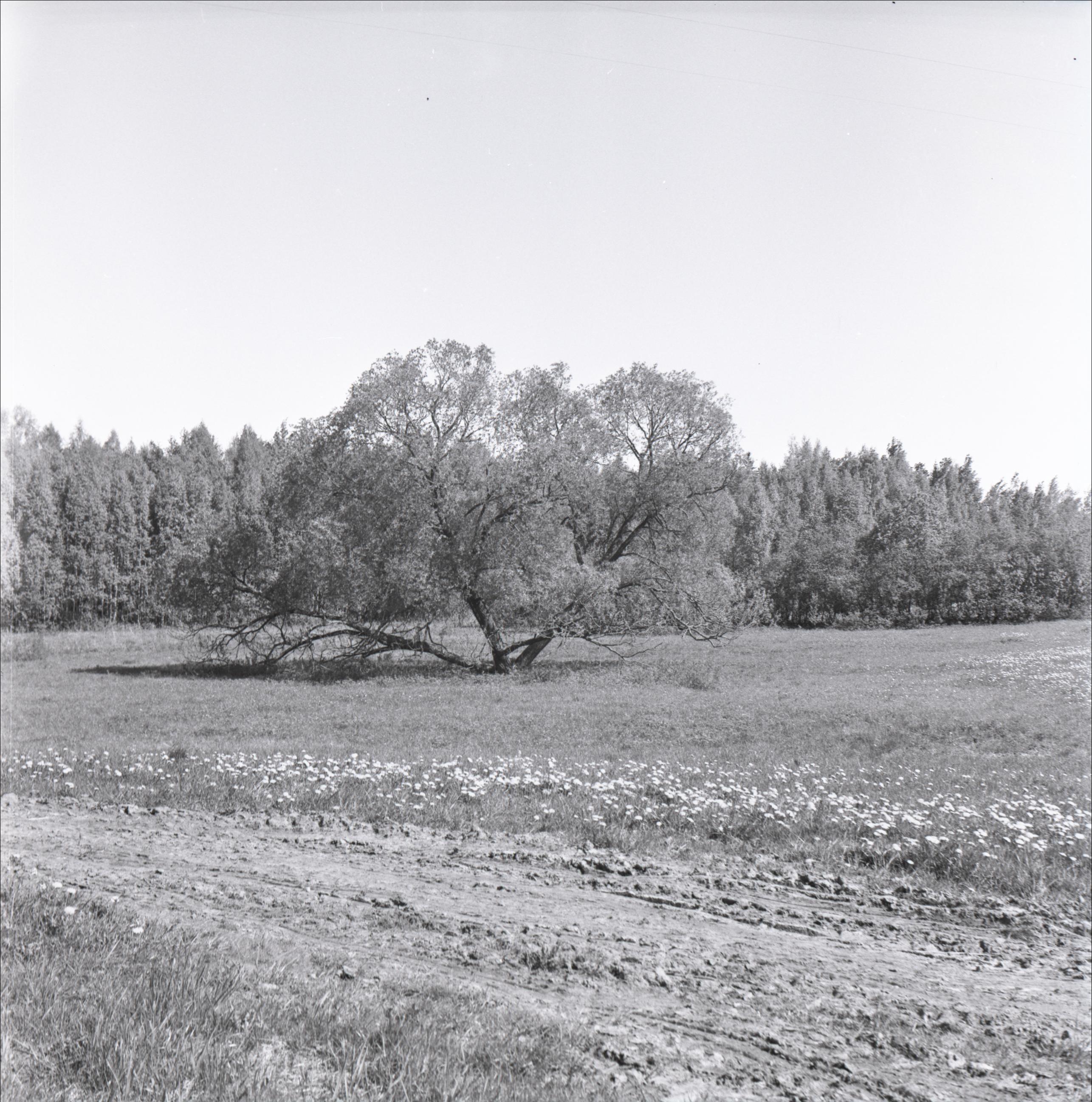 Vieta, kur nošauts Pēteris Znotiņš: Pļava, koks, fonā mežs