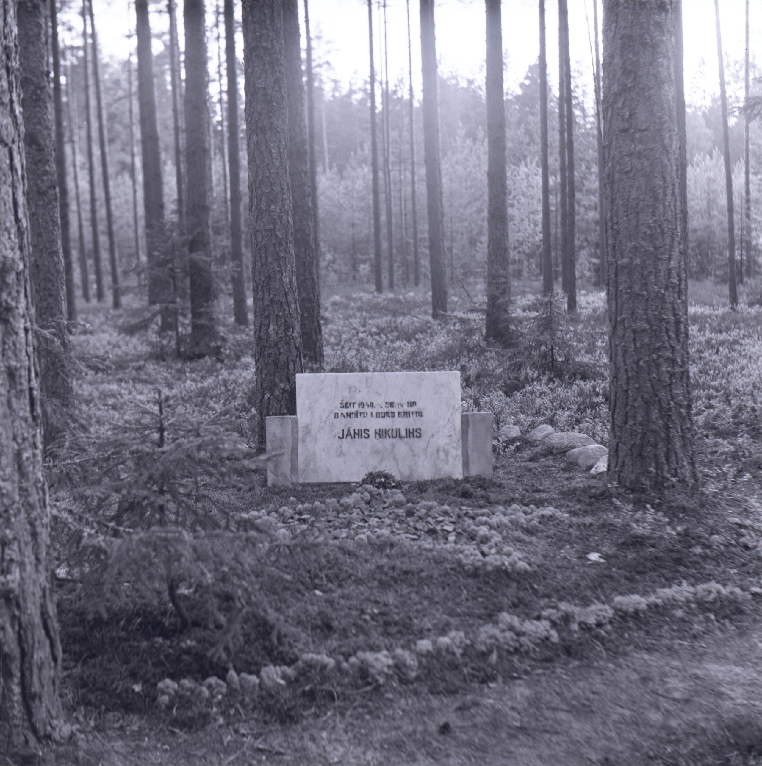 Vieta, kur 1948. gadā kritis J. Ņikuļins: Kapa plāksne, mežs